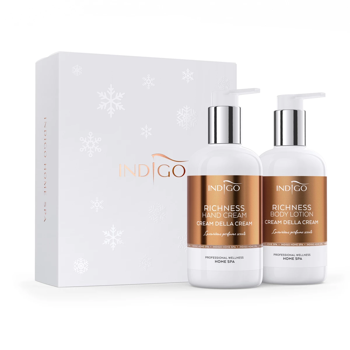 Szukasz idealnego prezentu dla swoich bliskich? A może chcesz sprawić odrobinę przyjemności samej sobie? Zestaw Indigo Home SPA Cream della Cream sprawdzi się w obydwu przypadkach! Balsam do ciała i krem do rąk zapewnią Ci skuteczną i kompleksową pielęgnację, a ich urzekający zapach wanilii i białego piżma połączonego z karmelem i orzechem laskowym pozostanie z Tobą jeszcze długo po aplikacji. Kosmetyki znajdują się w eleganckim opakowaniu, które idealnie nadaje się na prezent.