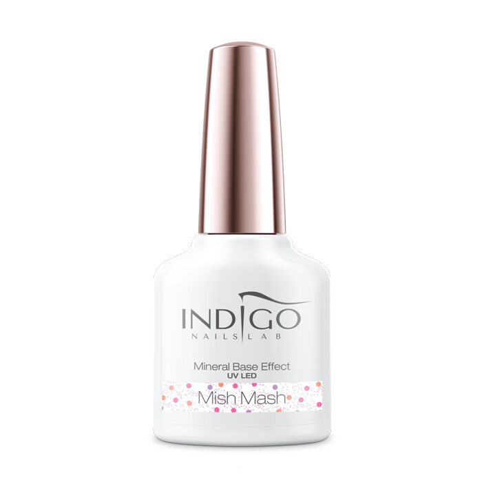 Mish Mash to połączenie bazy i koloru w jednym produkcie, który pozwala na wykonywanie stylizacji hybrydowych w ekspresowym tempie. Baza w kolorze mlecznym w odcieniu brzoskwiniowo-różowym z sześciokątnymi ozdobami w kolorze: fioletowym, różowym i pomarańczowym. Poziom krycia 40%