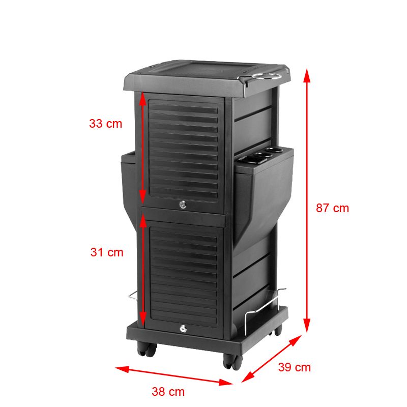 Pomocnik fryzjerski w kolorze czarnym ,z 2 zamykanymi roletami na kluczyk,posiada 4 kuwety i 15 schowków na asortyment fryzjerski. Stablina konstrukcja zapewni długotrwałe użytkowanie. Stolik osadzony na kółkach, dzięki którym narzędzia będą zawsze pod ręką. Pomocnik w częściach do samodzielnego montażu. wymiary paczki 81*23*40