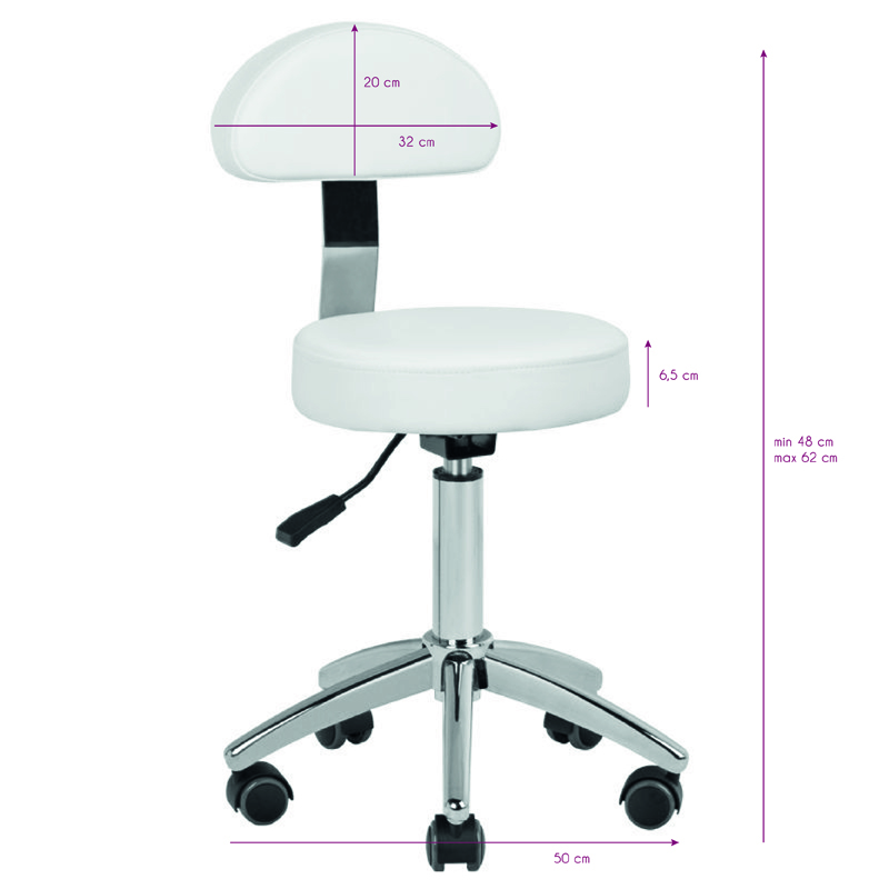 Wygodny taboret kosmetyczny, stabilny na pięcioramiennej podstawie, z gumowanymi kółkami, z możliwością demontażu oparcia, w kolorze białym, niezbędny mebel w gabinecie kosmetycznym.