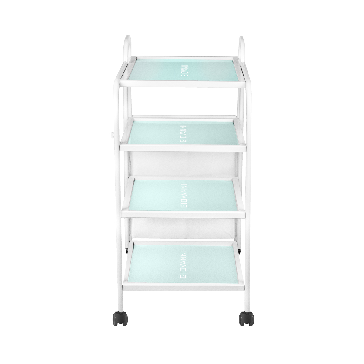Funkcjonalny metalowo-szklany stolik na gumowych kółkach. Stolik posiada cztery szklane półki z grawerowanym logo firmy GIOVANNI. Dodatkowym atutem stolika jest przymocowany do niego worek na brudne ręczniki i opaski kosmetyczne.