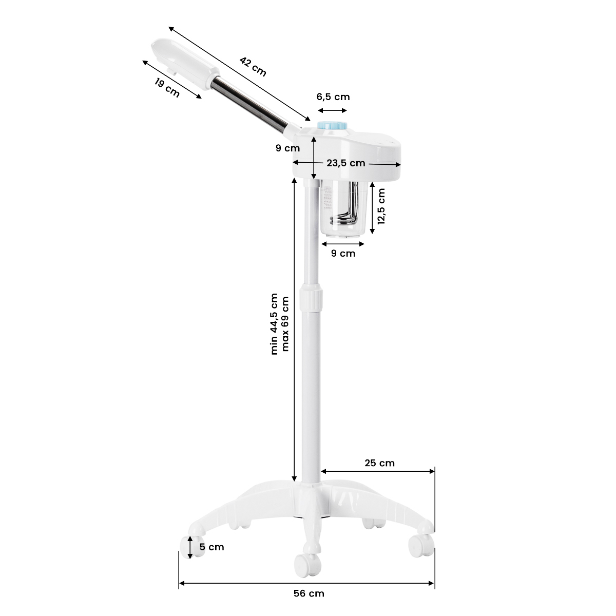 Minimalizm i funkcjonalnośćWapozon wykonano z trwałego tworzywa sztucznego w odcieniach bieli, co sprawia, że urządzenie łatwo utrzymać w czystości. Statyw wyposażony jest w regulację wysokości w zakresie 44,5-69 cm, co pozwala na ustawienie sprzętu na odpowiednim poziomie, by zapewnić komfort pracy osobie wykonującej zabieg. Dyszę wapozonu można obracać, co zwiększa zakres możliwego ustawienia. Pięcioramienna podstawa z kółkami poprawia mobilność, ułatwiając swobodne przestawianie urządzenia.