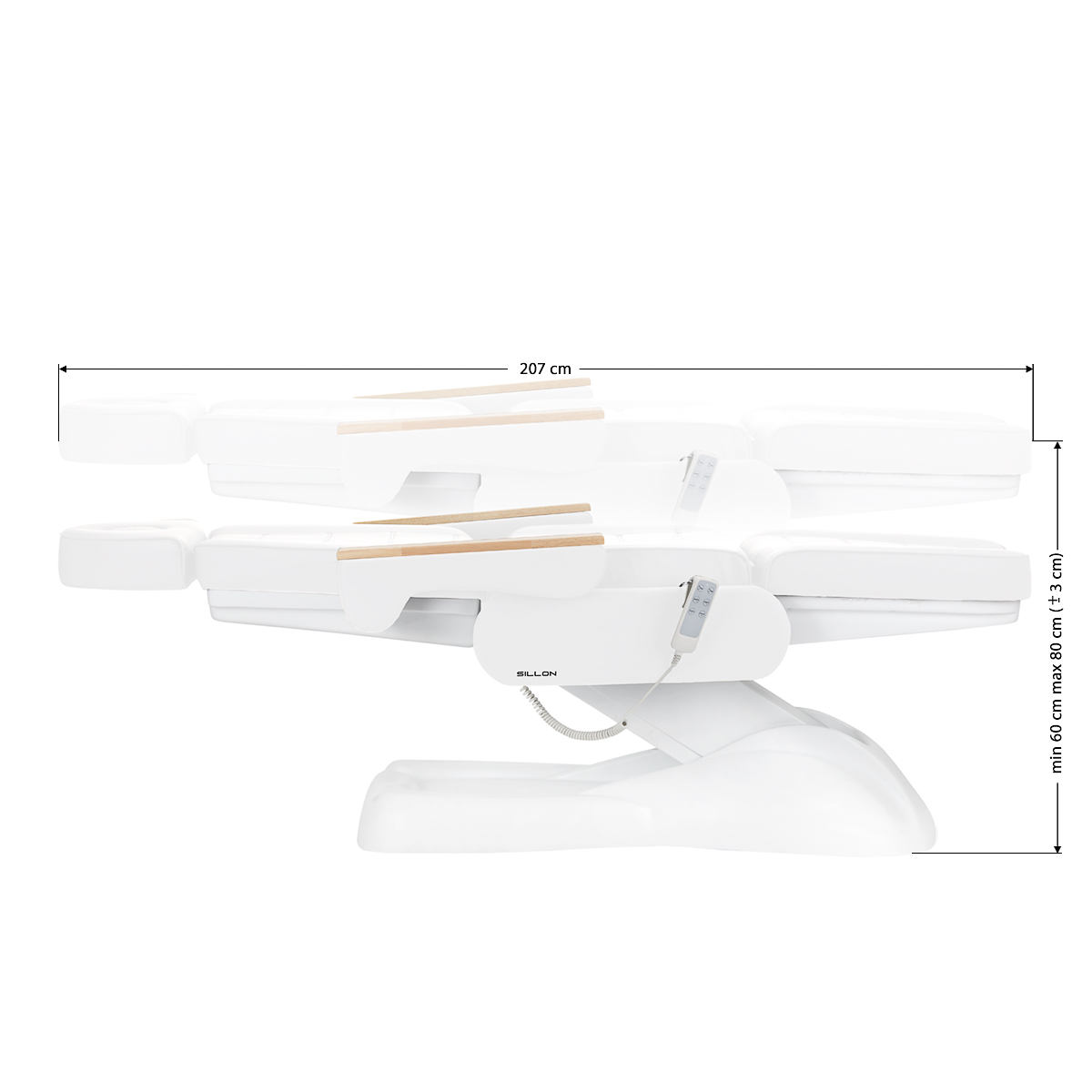 Klasyczny, ceniony model fotela kosmetycznegoFotel wypełniony jest pianką o odpowiedniej twardości oraz pokryty przyjemną w dotyku imitacją skóry w odcieniach bieli. Dzięki użyciu materiału, który jest łatwy do utrzymania w czystości oraz odporny na wybrane środki dezynfekcji, sprzęt jest komfortowy w użytkowaniu, wytrzymały na wilgoć oraz nieskomplikowany w czyszczeniu. Solidna podstawa wykonana z trwałego materiału w odcieniach bielizapewnia stabilność w trakcie zabiegów. Ozdobne drewniane elementy na podłokietnikach wyróżniają fotel pośród innych modeli, stanowiąc atrakcyjny wizualnie, elegancki akcent. Odpowiednio wyprofilowane obszycia nadają fotelowi stylowy wygląd i sprawiają, że siedzisko jest ergonomiczne.