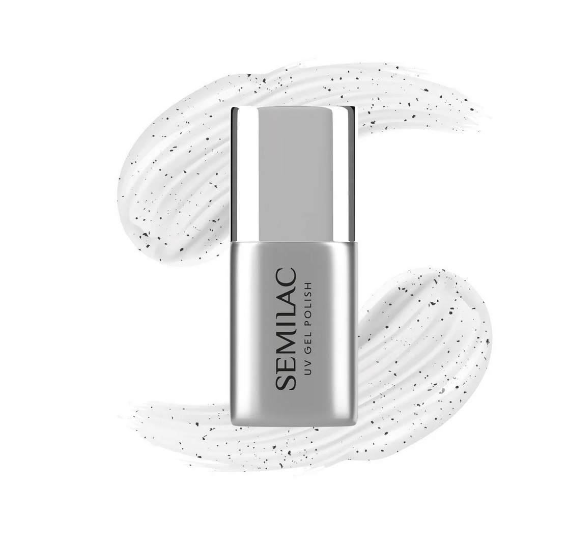 Semilac Top No Wipe Matt Stone Effect - is a simple way to spectacularly change your favorite manicure, giving the manicure a matte finish with the effect of stones. We have enriched the matte top with small black particles that will easily change any look. Manicure finished with a top is devoid of shine and streaks. It creates a pleasant to the touch "suede" finish. Top No Wipe Matt Stone Effect does not have a dispersion layer. The product does not require cleaning with a Cleaner and has a consistency similar to Semilac Top Mat Total No Wipe. Before each use, mix the product thoroughly.