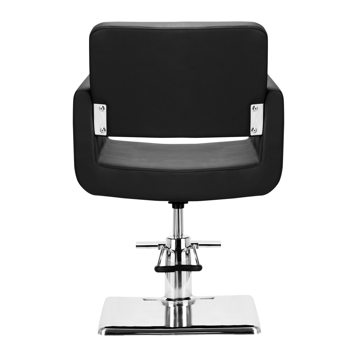 Efektowny fotel fryzjerskiSolidna, kwadratowa podstawa zapewnia stabilność podczas użytkowania, a jej polerowana, gładka powierzchnia nadaje elegancki wygląd. Siedzisko wypełnione trwałą, odporną na odkształcenia pianką oraz obite przyjemną w dotyku skórą syntetyczną jest wytrzymałe, odporne na wilgoć i łatwe do czyszczenia. Klasyczna czerń podkreśla ponadczasowy design, który harmonijnie wpisuje się zarówno w nowoczesne, jak i tradycyjne wnętrza salonów fryzjerskich.