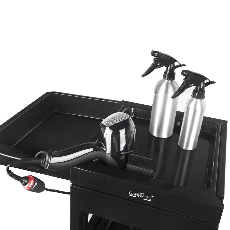Pomocnik fryzjerski dwustronny w kolorze czarnym, posiada 5 kuwet i schowki na asortyment fryzjerski. Stablina konstrukcja zapewni długotrwałe użytkowanie. Stolik osadzony na kółkach, dzięki którym narzędzia będą zawsze pod ręką.