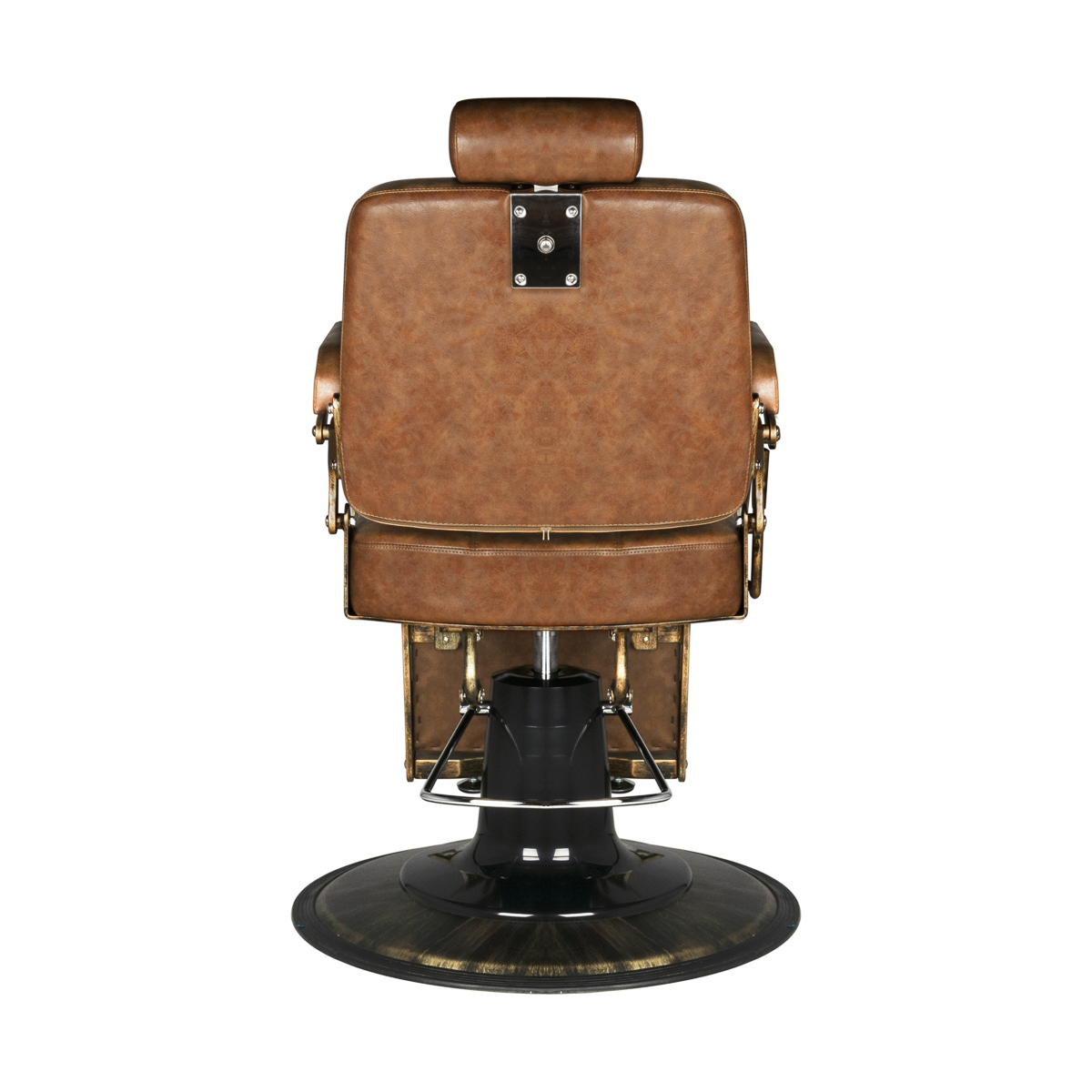 Wyjątkowy styl i funkcjonalnośćFotel barberski w stylu retro zachwyca eleganckim designem inspirowanym klasyką motoryzacji. Solidna, okrągła podstawa zapewnia stabilność oraz komfort użytkowania. Siedzisko wypełnione trwałą, odporną na odkształcenia pianką oraz obite przyjemną w dotyku skórą syntetyczną gwarantuje wygodę i wytrzymałość na lata. Zastosowane materiały sprawiają również, że sprzęt jest odporny na wilgoć oraz łatwy do czyszczenia. Pikowana tapicerka w odcieniu jasnego brązu, wykonana z dbałością o detale, podkreśla luksusowy charakter mebla. Stylizowane metalowe podłokietniki i rama w odcieniu postarzanego złota nadają całości wyjątkowego charakteru.