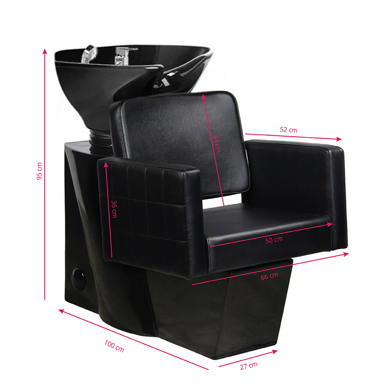 Profesjonalna myjnia fryzjerska -stabilna, niezwykle wygodna, solidnie wykonana. Nowoczeny design czyni z niej piękne dopełnienie wyposażenia nowoczesnego salonu fryzjerskiego. Siedzisko wykonane z wysokiej jakości ekoskóry, z ciekawym przeszyciem bocznym. Silikonowa podkładka pod głowę stabilizuje głowę klienta i pozwala na jej wygodne ułożenie na myjce. Misa myjki w kolorze czarnym, z możliwością regulacji swojego nachylenia. Myjnia w kolorze czarnym.