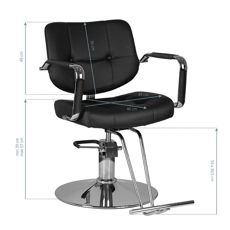 Nowoczesny fotel fryzjerski o nowoczesnym designie. Bardzo wygodny, idealnie pasujący do nowoczesnych salonów. . Specjalnie wyprofilowany, by zapewnic klientowi wygodną pozycję podczas zabiegu. Regulowany w płaszczyźnie pionowej. Bardzo stabilny i solidny. Obicie z wysokiej jakości ekoskóry. Kolor czarny.