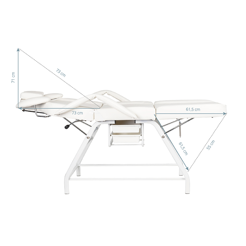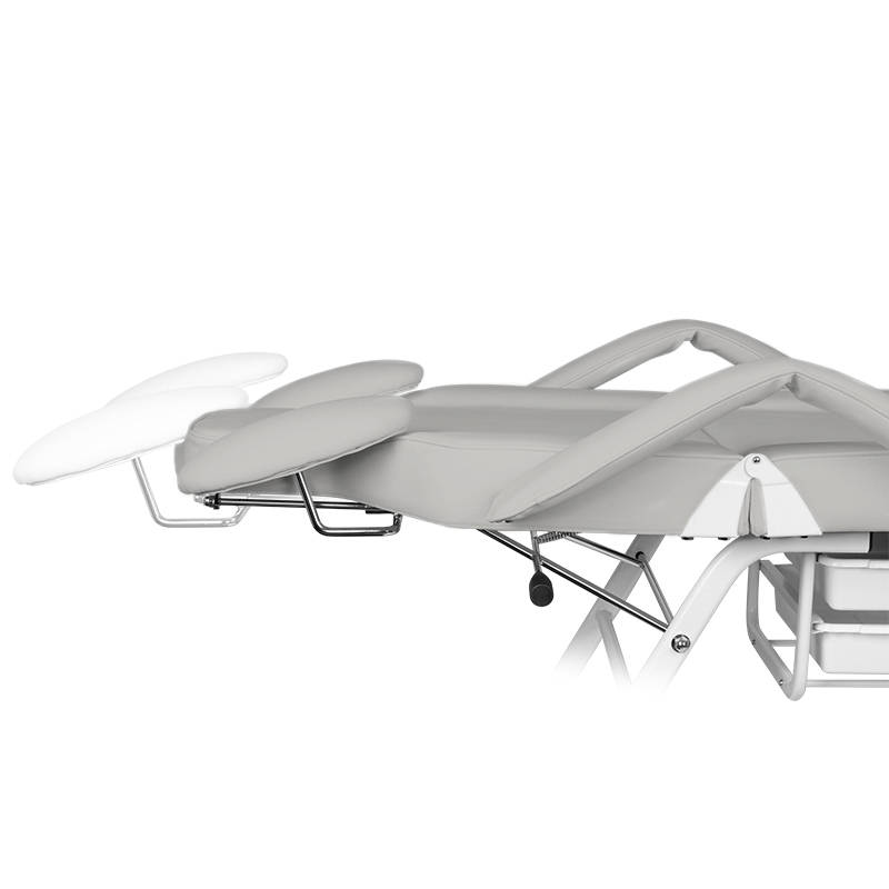Fotel posiada ręczną regulację podnóżka, oparcia oraz podparcia rąk dla wykonywującego zabieg. Zastosowane podparcie rąk jest niezwykle praktycznym rozwiązaniem nie spotykamym w innych fotelach. Wyposażony w wygodną poduszkę dla klienta oraz podręczne kuwety na umieszczenie niezbędnych akcesoriów.