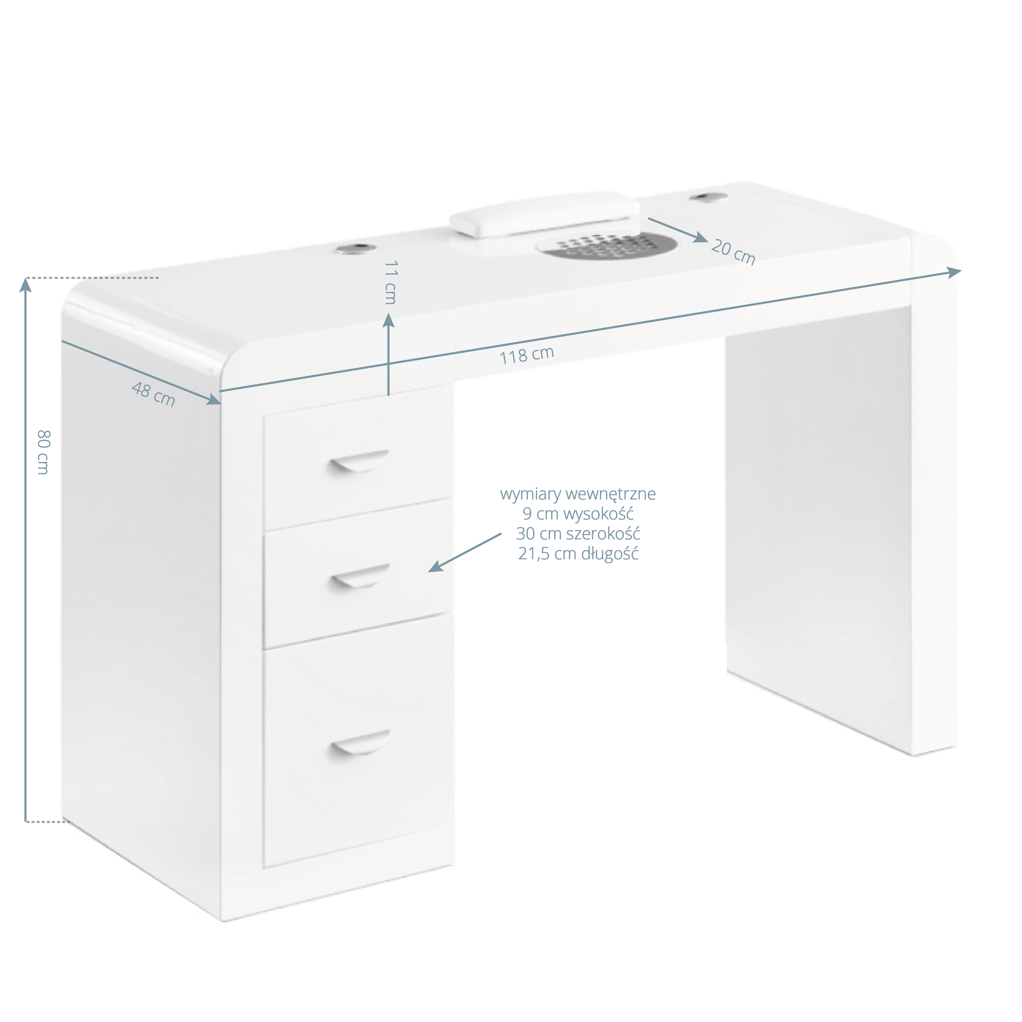 Doskonały sposób na idealne miejsce pracyTrzy obszerne szuflady ułatwiają organizację oraz utrzymywanie porządku w najpotrzebniejszych kosmetykach i narzędziach. Biurko wyposażone jest w praktyczny pochłaniacz, który skutecznie ogranicza ilość szkodliwego pyłu, zapewniając czyste i świeże powietrze w miejscu pracy. Jednocześnie dzięki wbudowaniu go w blat nie zajmuje cennej przestrzeni roboczej. Specjalnie zaprojektowane miejsca na kable ułatwiają organizację niezbędnych w salonie urządzeń, takich jak frezarki, lampy zabiegowe czy do paznokci, pozwalając na ukrycie przewodów.