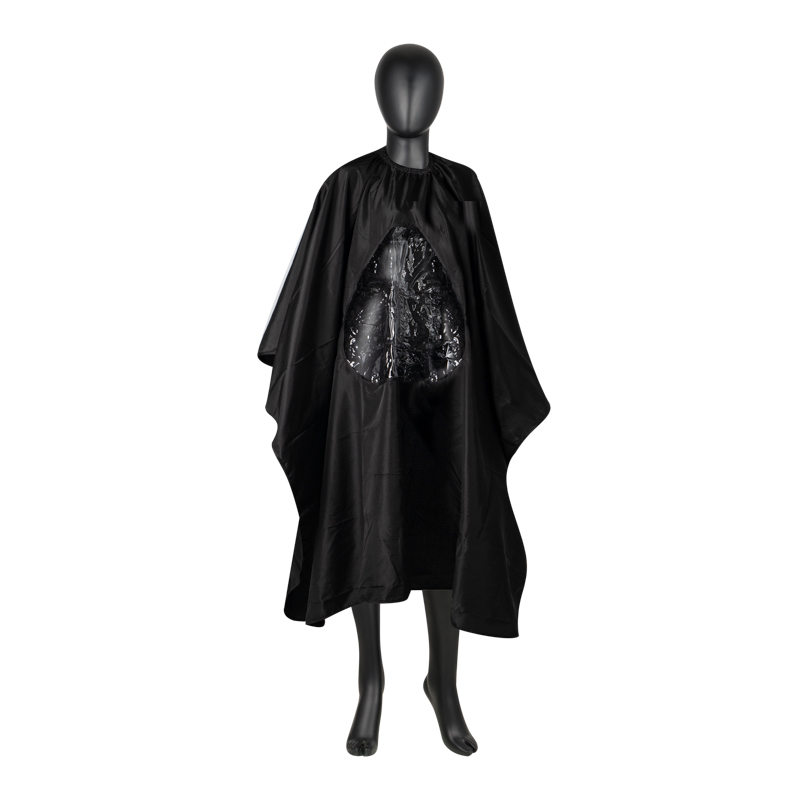 Peleryna fryzjerska wykonana jest z wysokiej jakości materiału (100% polyesrer), przez co włos nie wbija się, lecz ześlizguje się po powierzchni peleryny. Dodatkowo peleryna posada "okienko" umożliwiające kożystanie ze smartfonu.