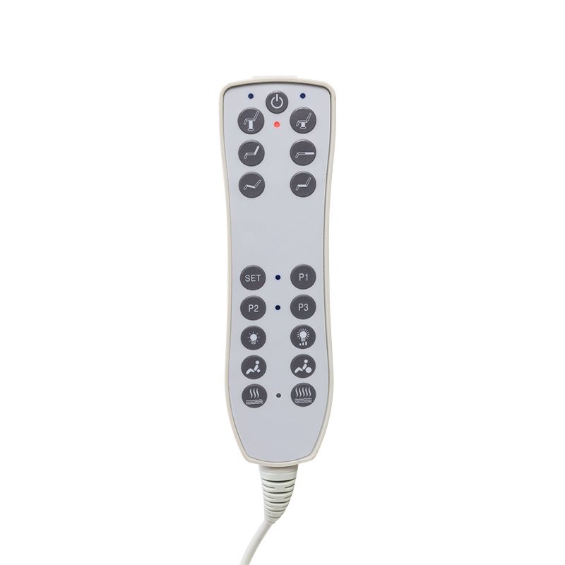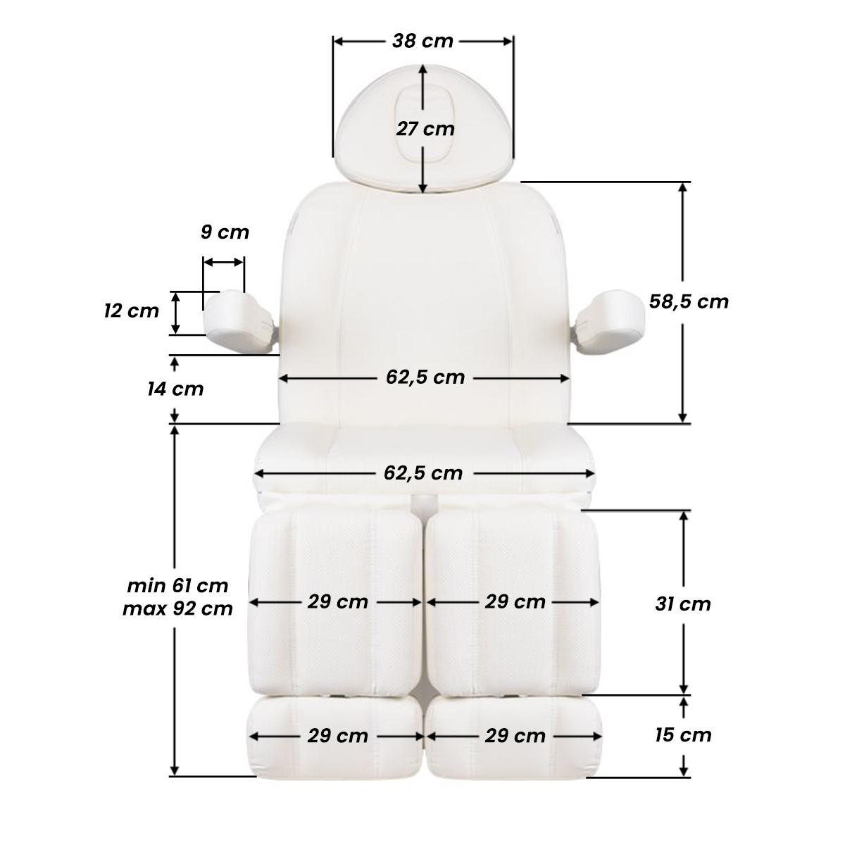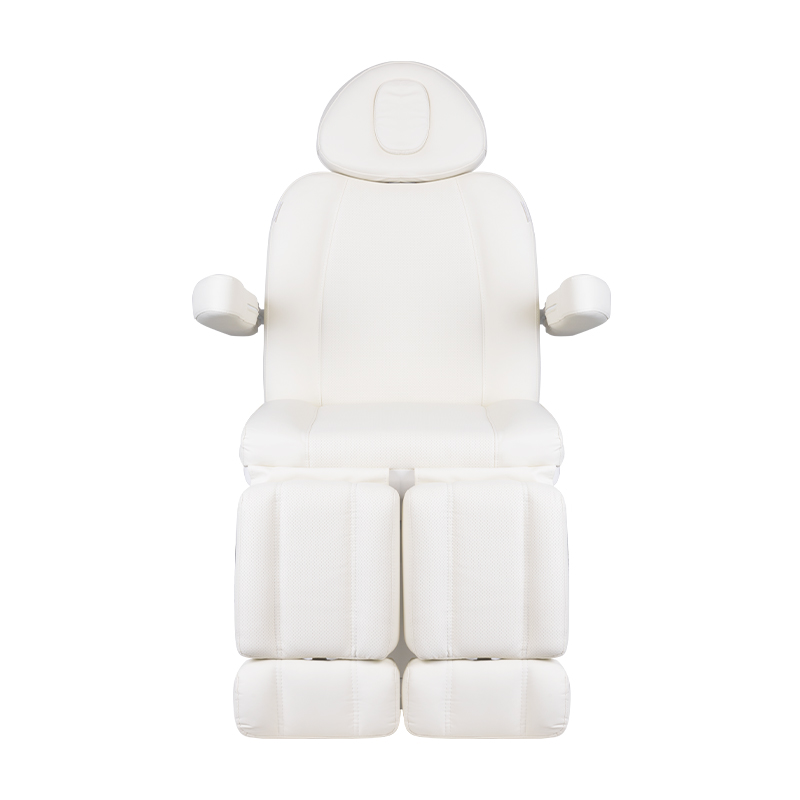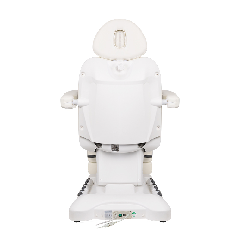 Wyjątkowy fotel kosmetyczny elektryczny idealnie nadający się do gabinetów kosmetycznych oraz salonów SPA. Dzięki niezależnym siłownikom umożliwia regulację fotela w 3 płaszczyznach płaszczyznach za pomocą pilota i przełaczników nożnych dając możliwość komfortowego przeprowadzenia zabiegów pedicure oraz na twarz i ciało. Używając pilota możemy korzystać z zaprogramowanych ustawień oraz uruchamiać funkcję HOT czyli podgrzewanie. W fotelu została zastosowana tapicerka perforowana niespotykana w innych fotelach oraz kolorowe podswietlenie LED podstawy.