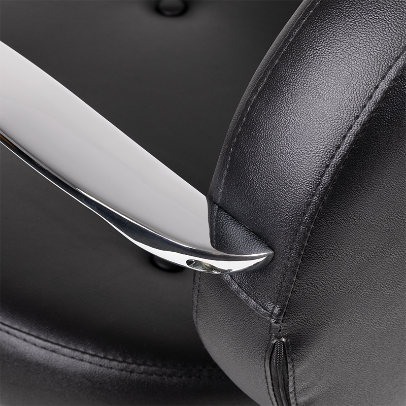 Regulowany w płaszczyźnie pionowej. Bardzo stabilny i solidny. Obicie z najwyższej jakości ekoskóry koloru czarnego