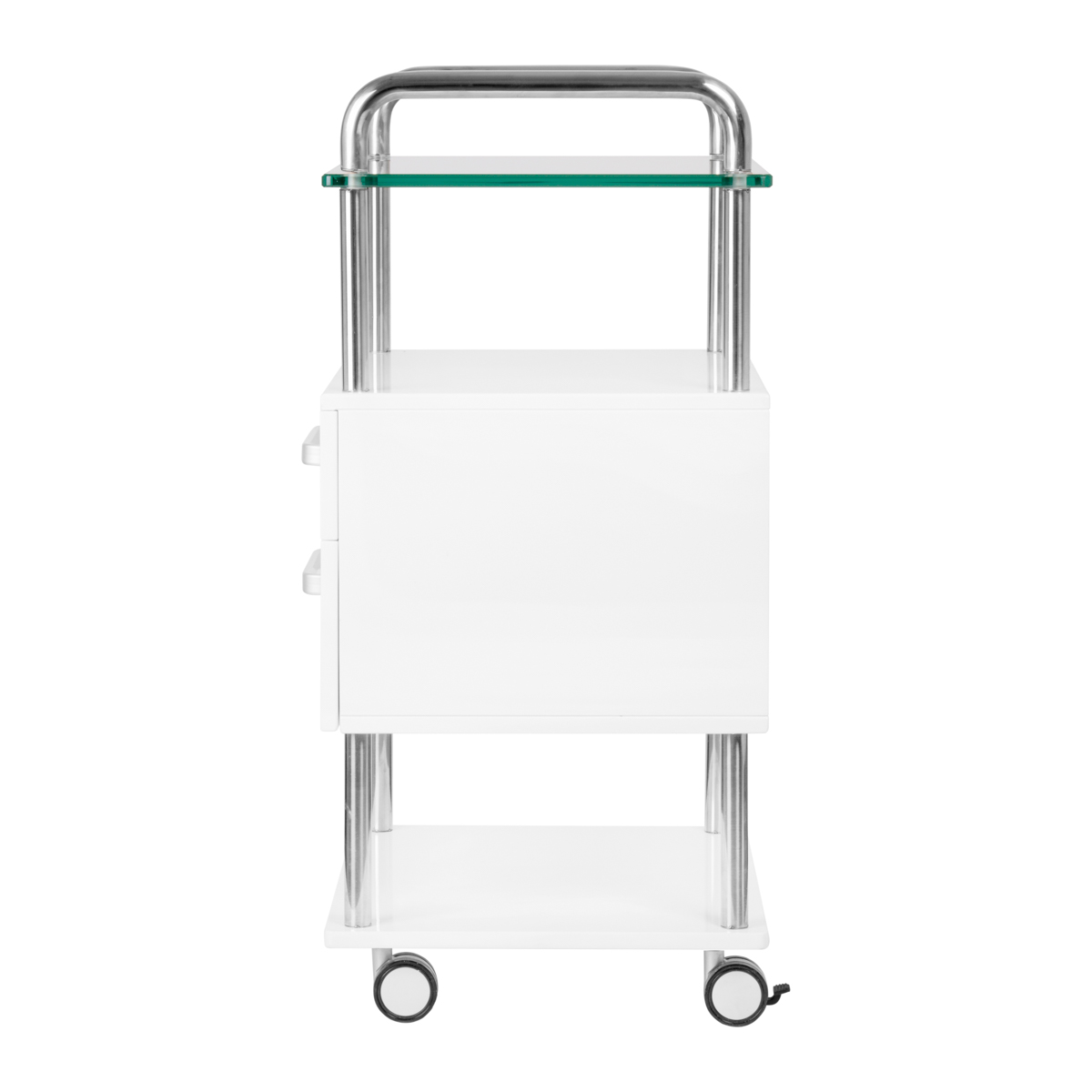 Wysokiej jakości pomocnik podologiczny to funkcjonalny mebel kosmetyczny na kółkach. Dzięki swojej mobilności możesz transportować go do innych pomieszczeń zabiegowych. Pomocnik posiada szklany blat roboczy, dwie szuflady na narzędzia, akcesoria oraz półkę na frezarkę podologiczną lub inne urządzenie.
