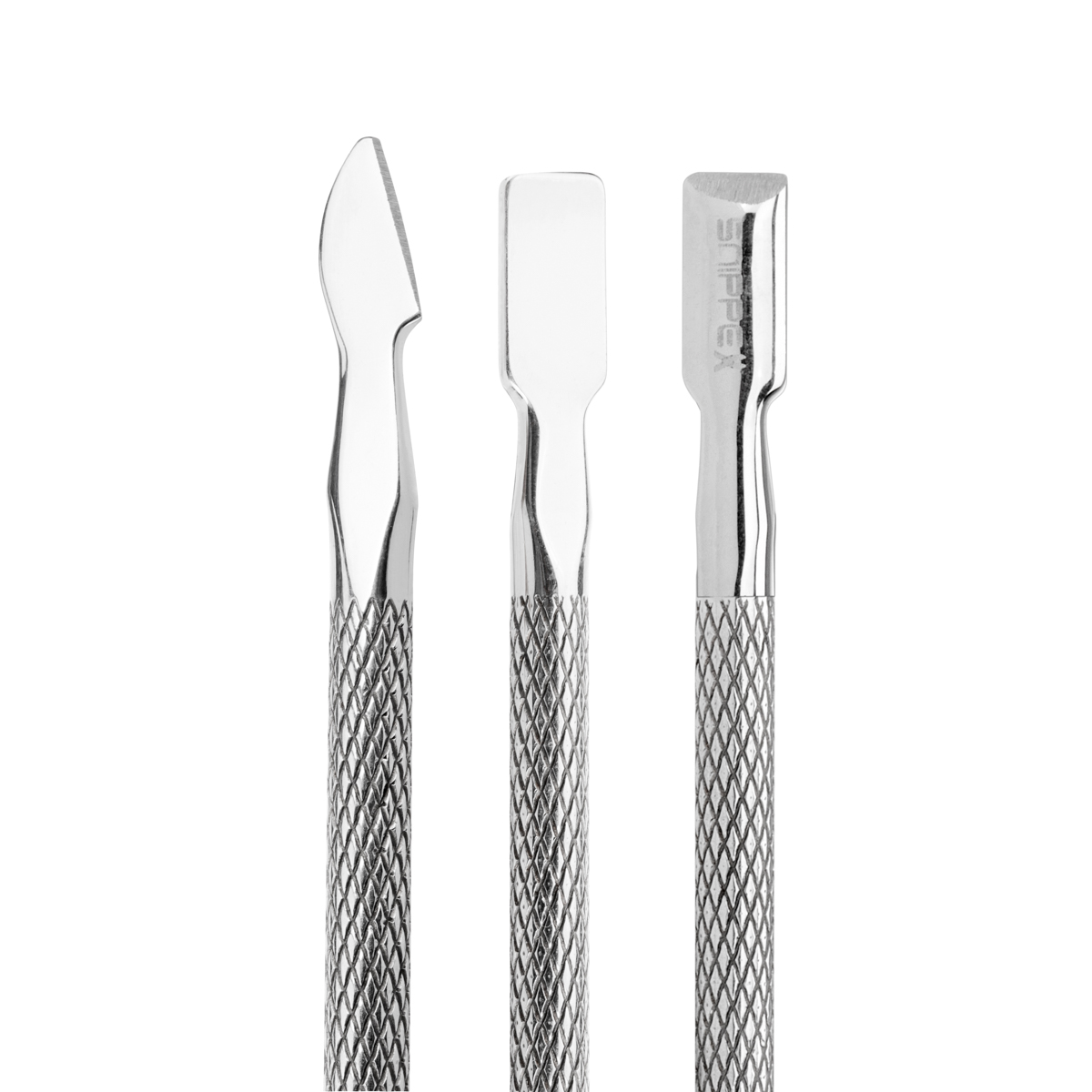 • Ścięty nożyk służy do wycinania skórek, zwłaszcza z boków płytki. Sposób wyprofilowania końcówki ułatwia precyzyjną pracę.