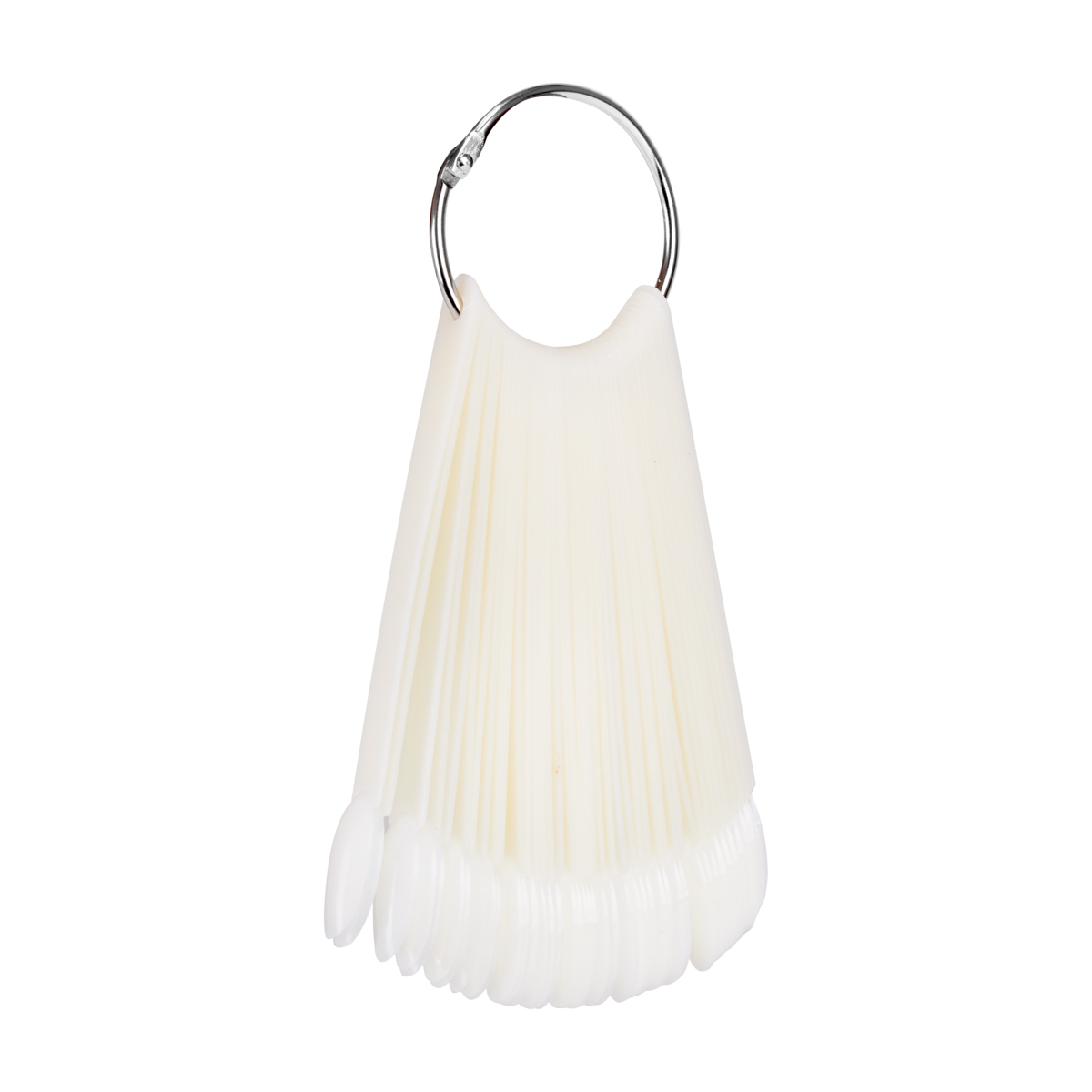 Estetyczna prezentacja kolorów i zdobieńWzornik w mlecznym kolorze pozwala na estetyczną prezentację wszelkich kolorów lakierów klasycznych oraz hybrydowych, pyłków czy żeli. Składa się z 50 pojedynczych tipsów o owalnym kształcie i w rozmiarze odpowiadającym prawdziwym paznokciom. Spięty jest praktycznym, rozpinanym kołem, które ułatwia przechowywanie całości. Każdy z tipsów wykonano z trwałego tworzywa sztucznego.