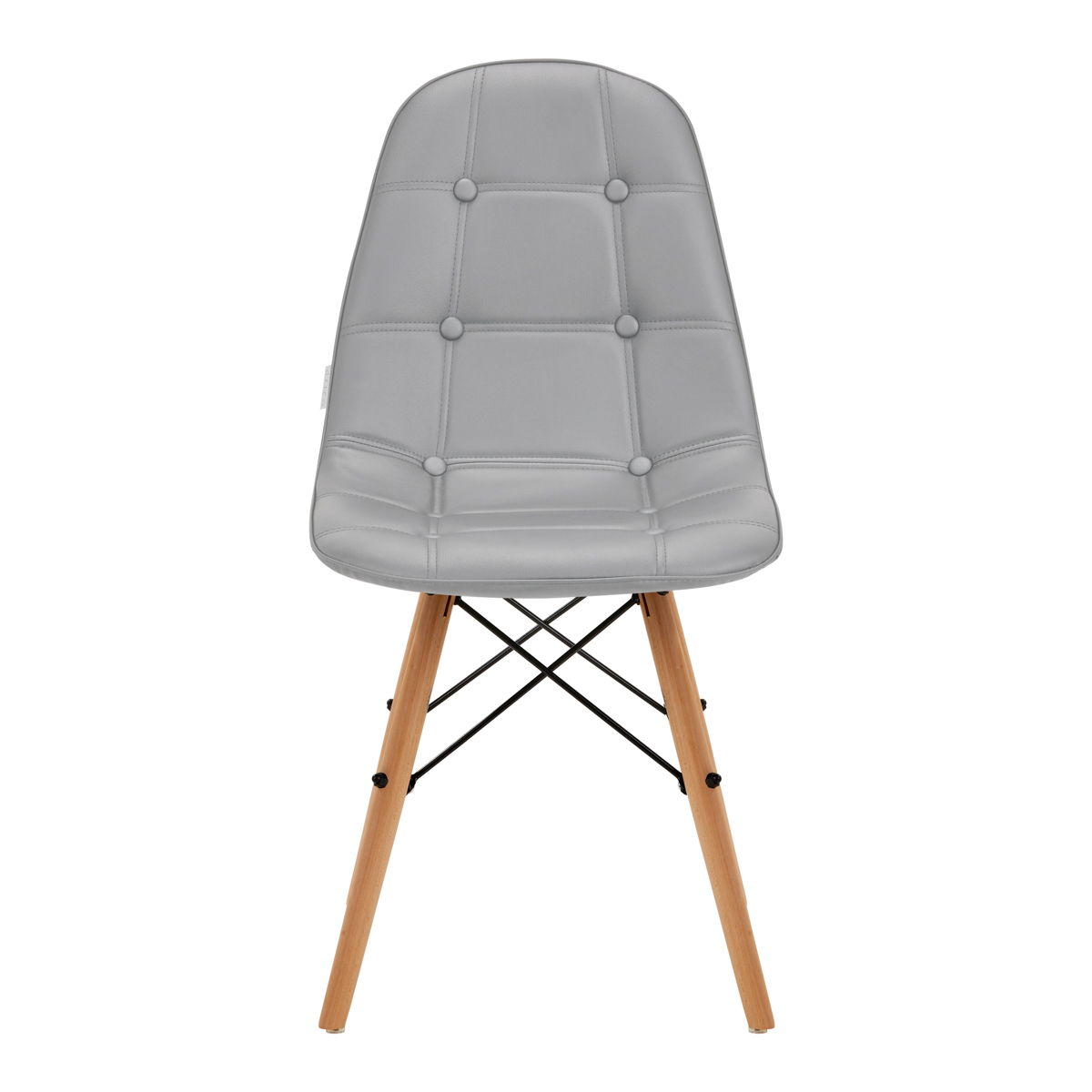 Wygodne krzesło w skandynawskim styluSiedzisko wypełnione jest gąbką i pokryte tapicerką z przyjemnej w dotyku skóry syntetycznej w odcieniach szarości, która jest bardzo łatwa do utrzymana w czystości. Niewielkie plamy i zabrudzenia można w prosty sposób usunąć lekko zwilżoną ściereczką. Estetyczne pikowanie oraz staranne przeszycia stanowią elegancki sznyt, a metalowy stelaż w odcieniach czerni dodaje meblowi stabilności. Matowo wykończone drewniane nóżki zakończono plastikowymi zabezpieczeniami, dodatkowo chroniącymi przed przypadkowym uszkodzeniem. Krzesło w stylu skandynawskim jest komfortowym meblem, który stanie się ozdobą recepcji każdego salonu kosmetycznego.