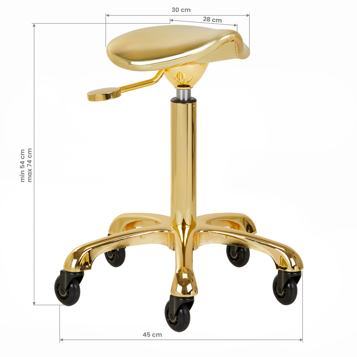 Unikalny design, który przykuwa wzrokWyjątkowy wygląd taboretu zapada w pamięć, wygląda niezwykle elegancko i będzie stanowić stylowy element każdego wnętrza. Świetnie sprawdzi się zarówno w salonach fryzjerskich, jak i kosmetycznych. Chromowany stelaż oraz stabilna pięcioramienna podstawa wraz z kauczukowymi kółkami zapewniają bezpieczne użytkowanie, znaczną mobilność oraz możliwość dopasowania do własnych potrzeb. Odpowiednio wyprofilowane na kształt siodła siedzisko wypełnione niepodatną na odkształcenia pianką gwarantuje użytkownikom wygodę. Pokrycie z półmatowej skóry syntetycznej w odcieniach złota jest łatwe w czyszczeniu, trwałe oraz odporne na wilgoć.