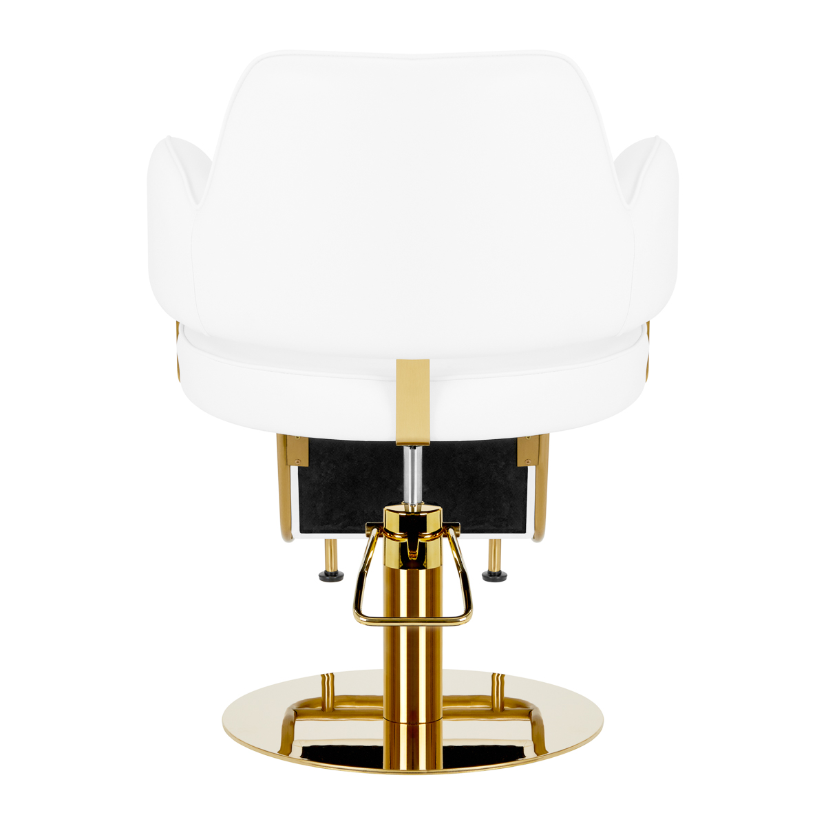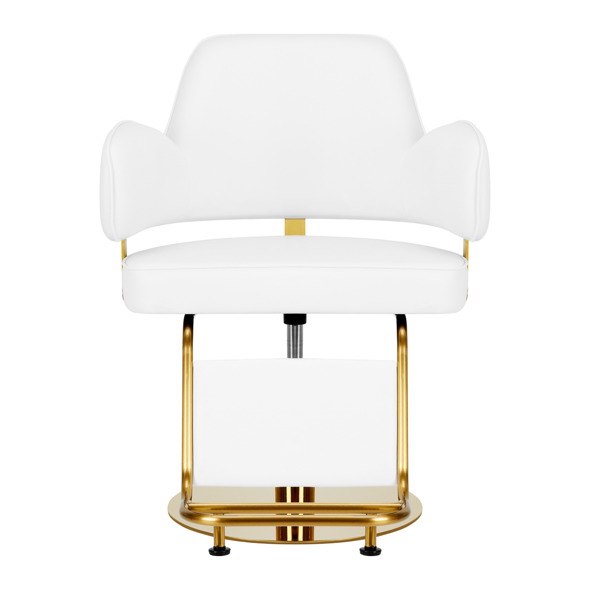 Prostota i wysoki komfort użytkowaniaWygodny mebel wypełniony jest trwałą, odporną na odkształcenia pianką, z kolei obicie wykonane jest z przyjemnej w dotyku skóry syntetycznej. Zastosowane materiały zapewniają komfortowe użytkowanie mebla przez długi czas i sprawiają, że sprzęt jest odporny na wilgoć, wytrzymały oraz łatwy do czyszczenia. Pokrycie w odcieniach bieli oraz ozdobne elementy w barwach złota nadają mu wyraz ponadczasowej elegancji. Fotel fryzjerski Gabbiano Linz NQ wyróżnia minimalistyczny design, który nadaje mu wyjątkowy charakter i sprawia, że fotel będzie doskonale prezentować się w wielu eleganckich salonach.