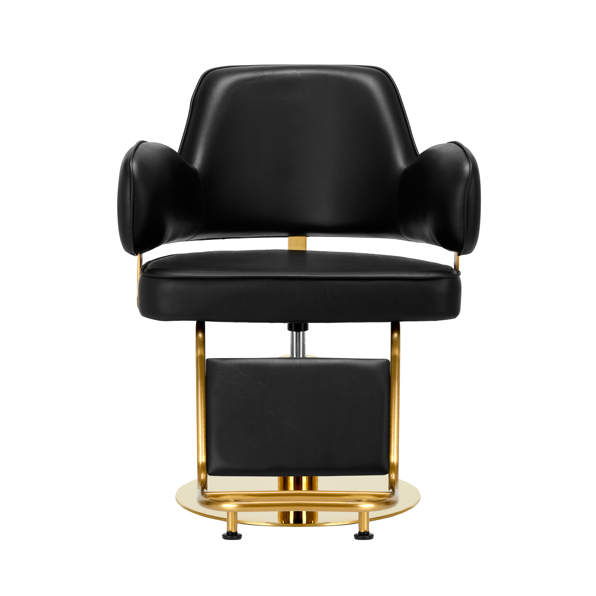 Prostota i wysoki komfort użytkowaniaWygodny mebel wypełniony jest trwałą, odporną na odkształcenia pianką, z kolei obicie wykonane jest z przyjemnej w dotyku skóry syntetycznej. Zastosowane materiały zapewniają komfortowe użytkowanie mebla przez długi czas i sprawiają, że sprzęt jest odporny na wilgoć, wytrzymały oraz łatwy do czyszczenia. Pokrycie w odcieniach czerni oraz ozdobne elementy w barwach złota nadają mu wyraz ponadczasowej elegancji. Fotel fryzjerski B212G wyróżnia minimalistyczny design, który nadaje mu wyjątkowy charakter i sprawia, że fotel będzie doskonale prezentować się w wielu eleganckich salonach.