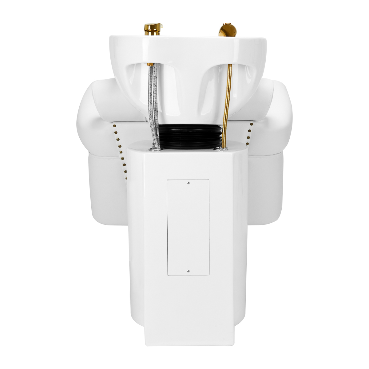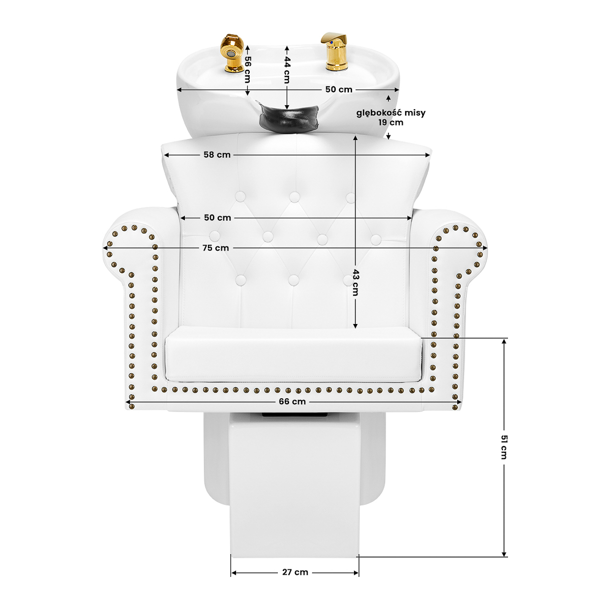 Funkcjonalny mebel o eleganckim wykończeniuOdpowiednio wyprofilowany fotel wypełniony trwałą pianką zapewnia odpowiednie wsparcie, a co za tym idzie wysoki komfort użytkowania. Podłokietniki pozwalają na prawidłowe ułożenie barków klienta. Przyjemne w dotyku pokrycie ze skóry syntetycznej w odcieniach bieli zapewnia wieloletnią trwałość oraz łatwość czyszczenia. Oryginalny, elegancki wygląd myjni z ozdobnym pikowaniem i złotymi elementami nadaje wnętrzom niepowtarzalnego wyrazu. W zestawie znajduje się kompletna armatura w odcieniach złota, w tym bateria, słuchawka prysznicowa oraz dedykowane węże, aby zapewnić całkowity zestaw narzędzi do pracy.