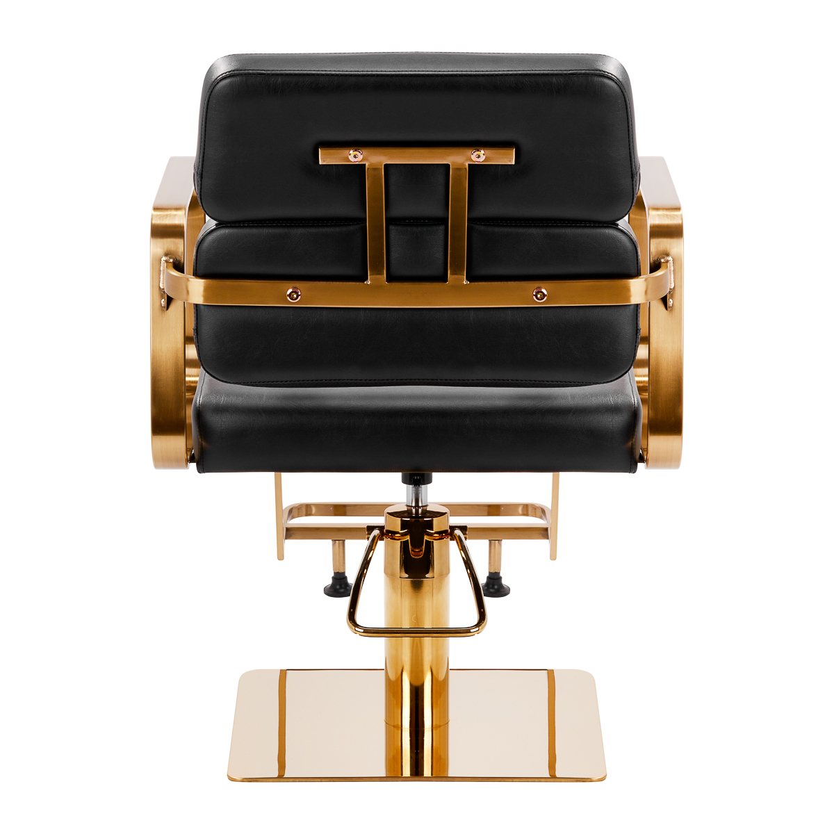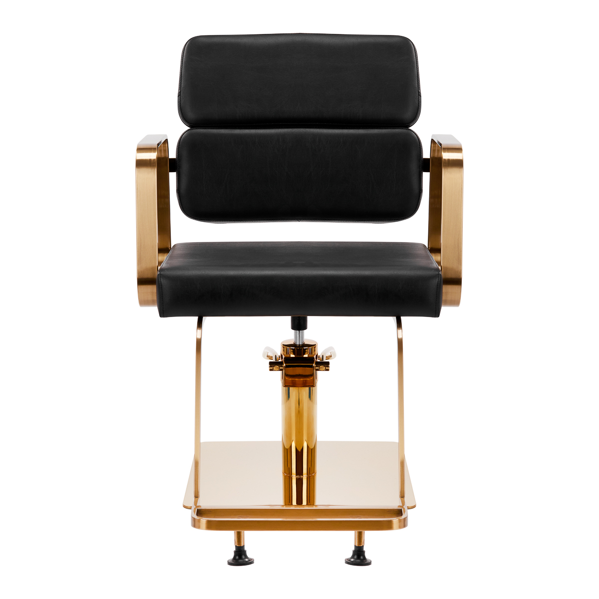 Rozwiązania dla ułatwienia pracyMechanizm pełnego obrotu, w który jest wyposażony fotel, sprawia, że praca fryzjera staje się bardziej efektywna i wygodna. Solidna, płaska podstawa w kształcie kwadratu gwarantuje stabilność w trakcie użytkowania. Matowo wykończona, gładka powierzchnia nadaje elementowi elegancki wygląd i sprawia, że ten jest łatwy do utrzymania w czystości. Wygodne siedzisko z wypełnieniem z pianki zapewnia wysoki komfort użytkowania, nawet podczas wielogodzinnych zabiegów. Geometryczne, metalowe podłokietniki w odcieniach złota pozwalają na prawidłowe ułożenie barków klienta – sprawia to, że nie chowa głowy w ramionach ani się nie garbi – co wyraźnie ułatwia wykonywanie precyzyjnych zabiegów, w tym strzyżenia. Dedykowany do tego modelu stylowy podnóżek zapewnia stabilne oparcie dla stóp użytkownika.