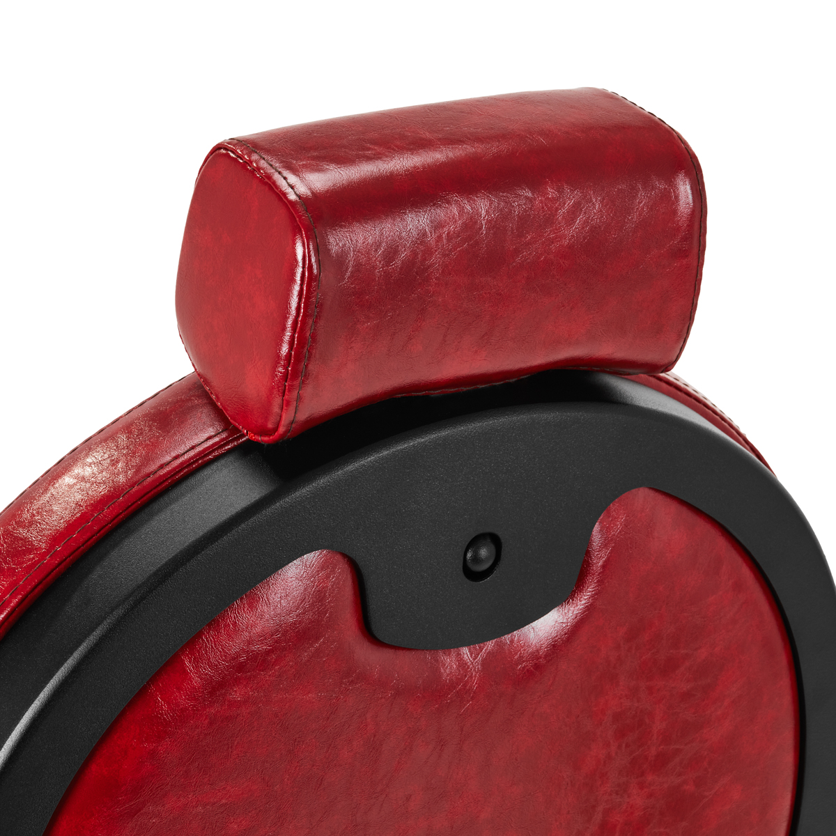 Finezyjny design przy wysokiej funkcjonalnościSolidna konstrukcja podstawy zapewnia stabilność oraz wysoki komfort użytkowania. Wypełnienie siedziska z trwałej, odpornej na odkształcenia pianki oraz obicie wykonane z przyjemnej w dotyku skóry syntetycznej o błyszczącym wykończeniu zapewniają trwałość mebla i jego komfortowe użytkowanie przez długi czas. Sprawiają również, że sprzęt jest odporny na wilgoć, wytrzymały oraz łatwy do czyszczenia. Pokrycie w odcieniach czerwieni z pikowaniem i ozdobnymi guzikami nadaje mu wyjątkowego charakteru. Fotel o charakterystycznym designie, nawiązującym do stylu vintage, doskonale wpasowuje się w klimat salonów barberskich, podkreślając ich wyjątkową atmosferę.