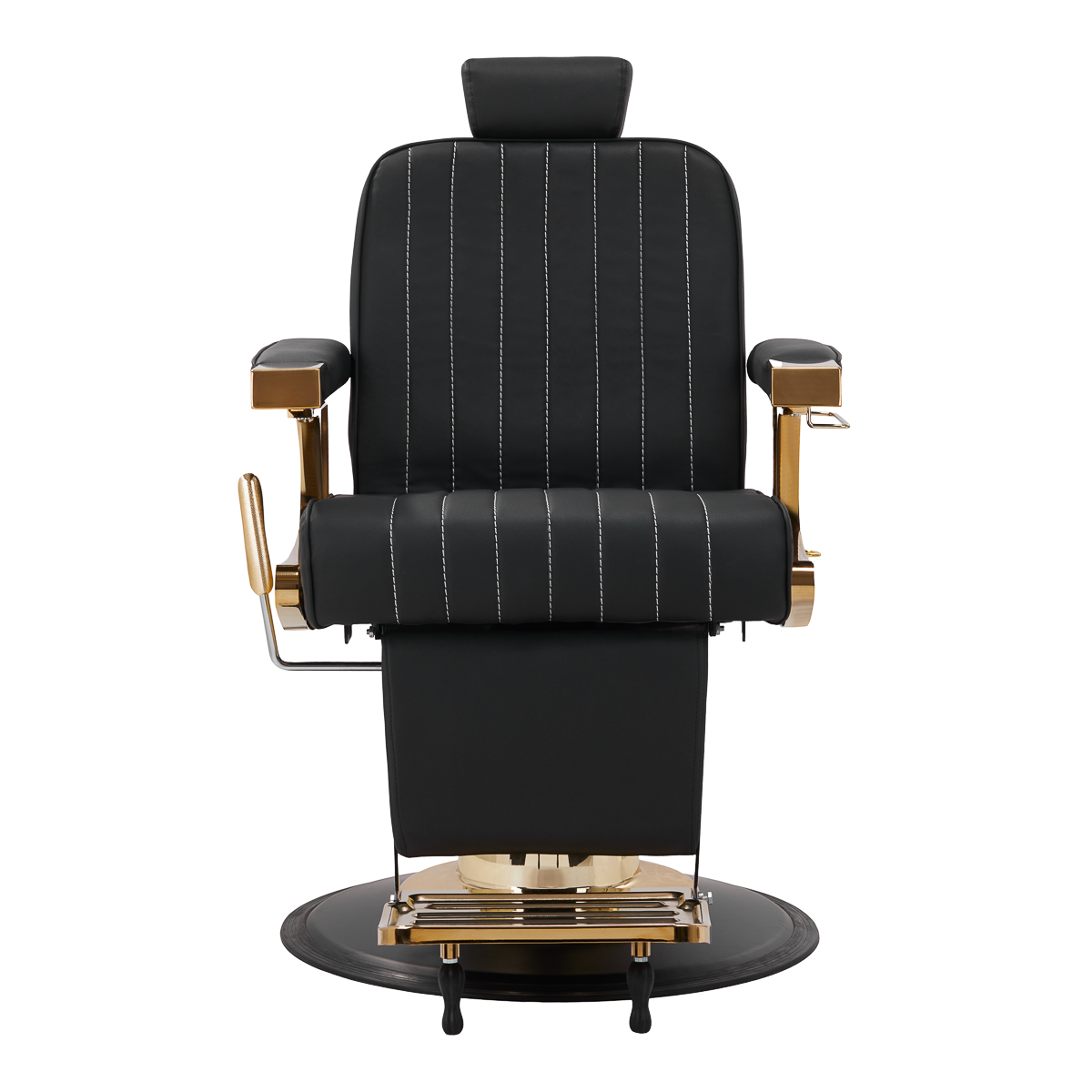 Nieprzeciętny designSolidna, szeroka konstrukcja podstawy zapewnia stabilność, a co za tym idzie – wysoki komfort użytkowania. Wypełnienie z trwałej, odpornej na odkształcenia pianki oraz obicie wykonane z przyjemnej w dotyku skóry syntetycznej zapewniają trwałość mebla i jego komfortowe użytkowanie przez długi czas. Sprawiają również, że sprzęt jest odporny na wilgoć, wytrzymały oraz łatwy do czyszczenia. Pokrycie w odcieniach czerni wraz z estetycznymi przeszyciami nadaje mu wyjątkowego charakteru. Designerskie polerowane elementy dekoracyjne, nawiązujące do stylu vintage, doskonale wpasują się w klimat salonów barberskich, tworząc ich niesamowitą atmosferę.