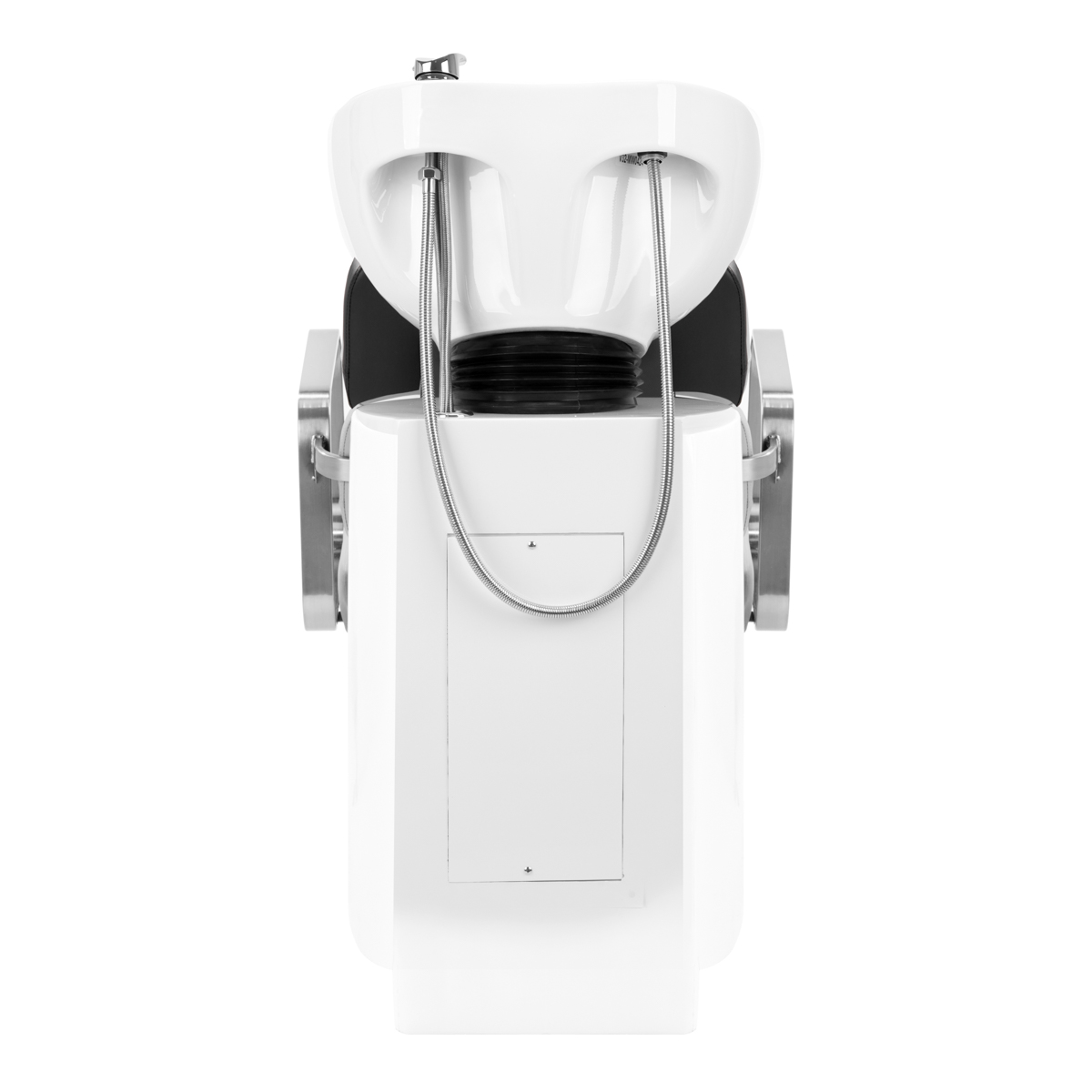 Gustowna umywalka dla komfortu użytkowaniaOdpowiednia głębokość białej ceramicznej misy umywalki zapobiega nadmiernemu rozchlapywaniu wody czy produktów stosowanych w trakcie zabiegów. Pozwala to na komfortowe i efektywne wykonywanie szerokiej gamy usług. Kąt nachylenia misy można dostosowywać, dzięki czemu łatwo o dopasowanie do indywidualnych potrzeb. Wysoka jakość zastosowanych materiałów sprawia, że umywalka jest wytrzymała, odporna na przebarwienia i zadrapania oraz bardzo łatwa do czyszczenia. Odpowiednio wyprofilowany kołnierz oraz nachylone oparcie zapewniają wsparcie i wygodę w trakcie mycia włosów, a dzięki komfortowej nakładce z tworzywa sztucznego w odcieniach czerni klient nie odczuje nieprzyjemności związanych z chłodem ceramicznej powierzchni.
