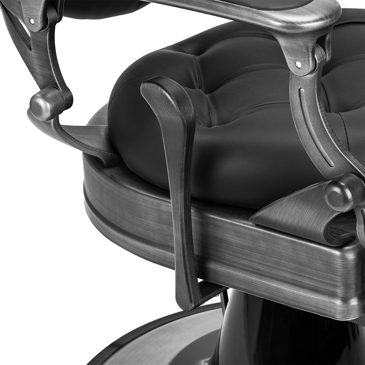 Finezyjny design przy wysokiej funkcjonalnościSolidna konstrukcja podstawy zapewnia stabilność oraz wysoki komfort użytkowania. Wypełnienie siedziska z trwałej, odpornej na odkształcenia pianki oraz obicie wykonane z przyjemnej w dotyku skóry syntetycznej o matowym wykończeniu zapewniają trwałość mebla oraz jego komfortowe użytkowanie przez długi czas. Zastosowane materiały sprawiają również, że sprzęt jest odporny na wilgoć, wytrzymały oraz łatwy do czyszczenia. Pokrycie w odcieniach czerni z pikowaniem i ozdobnymi guzikami oraz zdobiony podnóżek nadają mu wyjątkowego charakteru. Fotel o charakterystycznym designie, nawiązującym do stylu vintage, doskonale pasuje do klimatu salonów barberskich, podkreślając ich wyjątkową atmosferę.