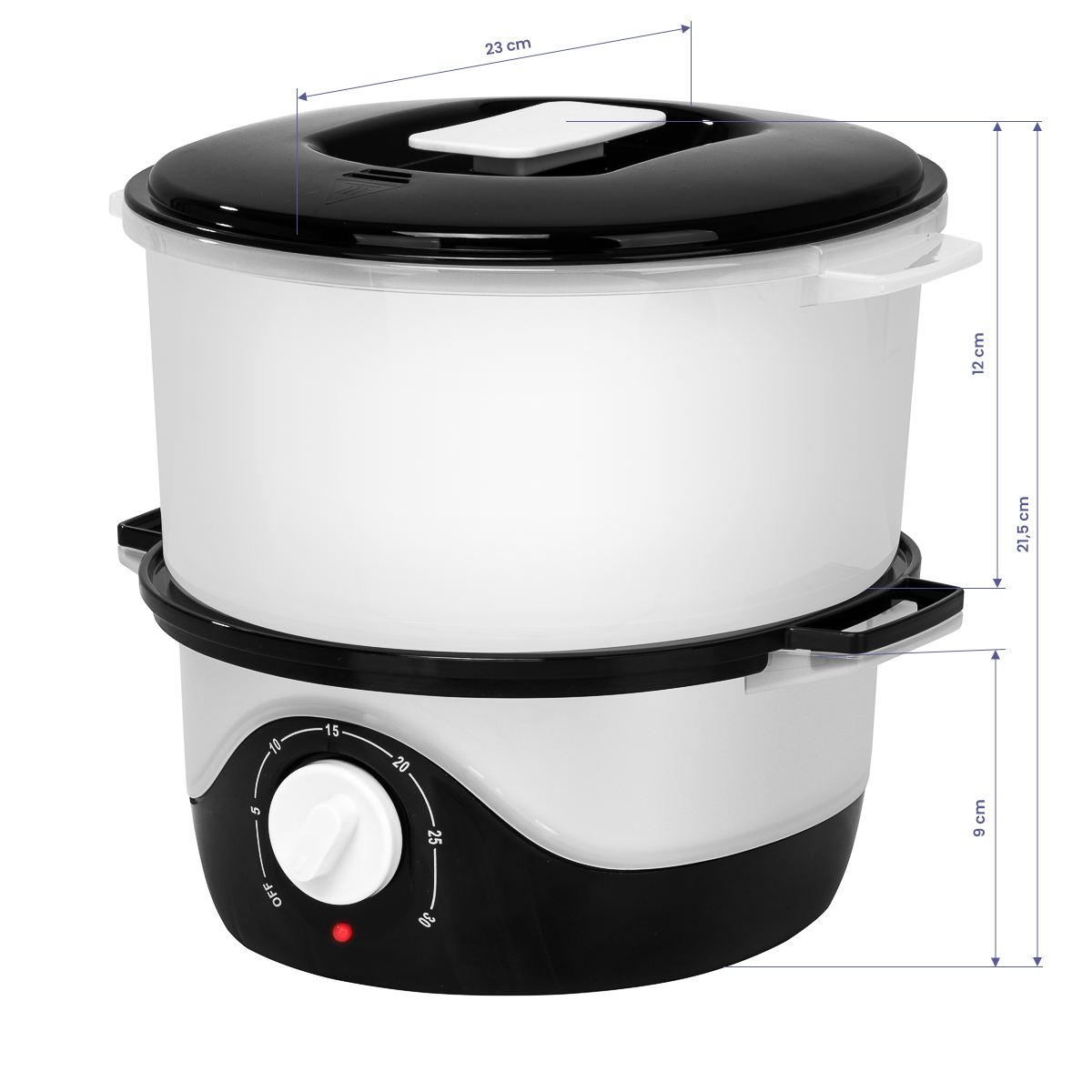 Funkcje dostosowane do potrzebModel wyróżnia się szybkim nagrzewaniem, osiągając maksymalną temperaturę w krótkim czasie, co czyni go idealnym wyborem dla profesjonalistów, umożliwiając efektywną pracę. Timer pozwala ustawić czas nagrzewania na 5, 10, 15, 20, 25 lub 30 minut, a po jego upływie urządzenie automatycznie się wyłącza, zapewniając pełne bezpieczeństwo użytkowania. Wodę można łatwo dolewać zarówno od góry pojemnika, jak i przez boczne wloty. Lampka kontrolna LED oraz oznaczenia minimalnego i maksymalnego poziomu napełnienia zwiększają wygodę obsługi.
