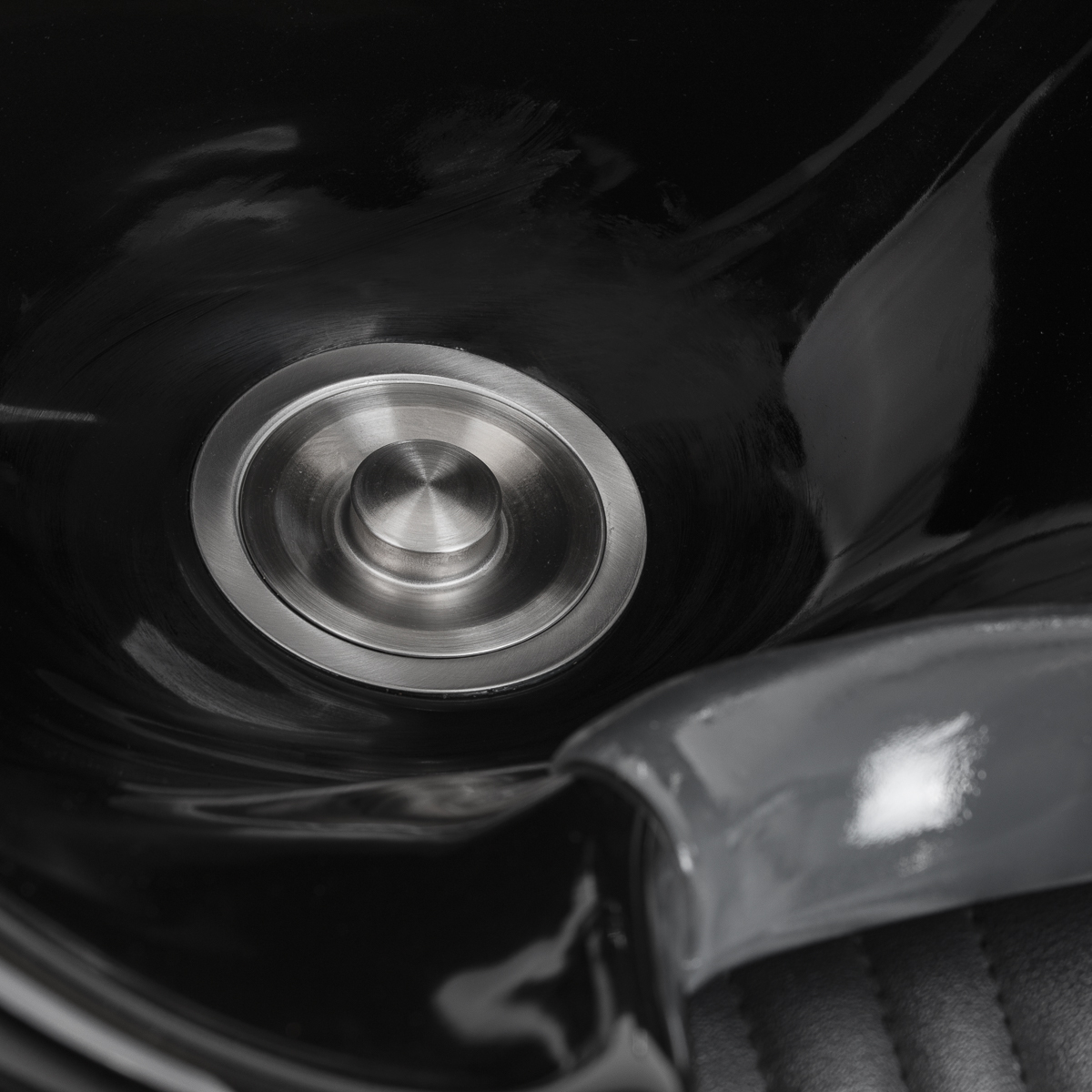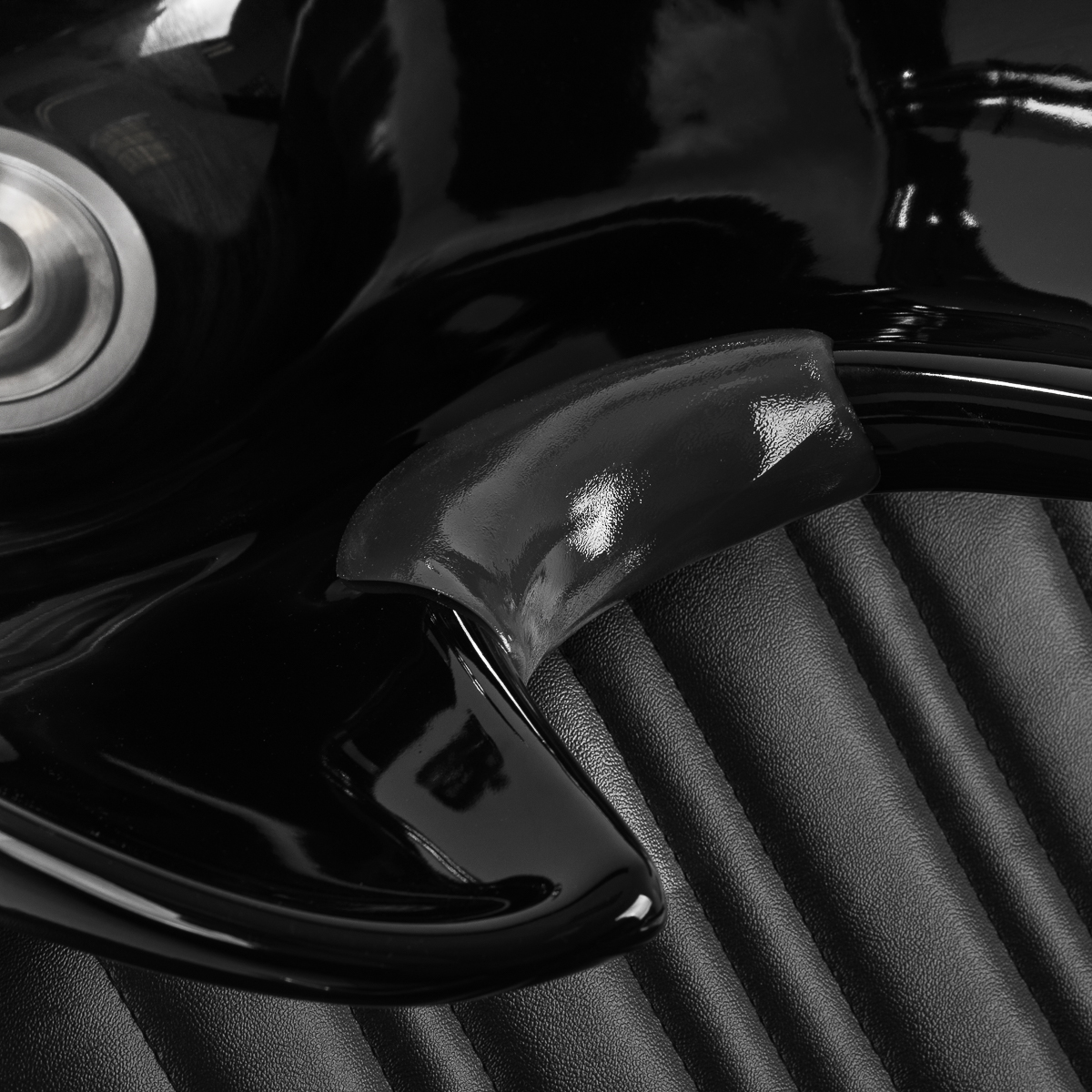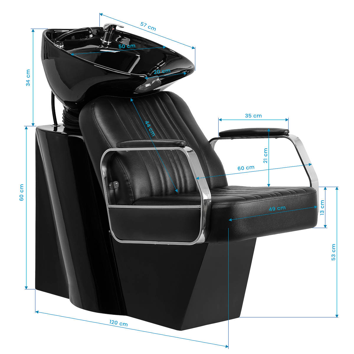 Funkcjonalny mebel z eleganckim sznytemWyprofilowany fotel wypełniony trwałą pianką zapewnia komfort użytkowania, a tapicerowane podłokietniki ułatwiają prawidłowe ułożenie barków klienta. Oparcie umieszczone pod optymalnym kątem sprzyja doskonałemu wsparciu kręgosłupa. Pokrycie ze skóry syntetycznej w odcieniach czerni gwarantuje wieloletnią wytrzymałość oraz łatwość czyszczenia. Stylowe przeszycia na tapicerce nadają myjni charakteru inspirowanego designem motoryzacyjnym, podkreślając jej efektowny wygląd. W zestawie znajduje się kompletna armatura w odcieniach chromu i czerni, w tym bateria, słuchawka prysznicowa oraz dedykowane węże, aby zapewnić całkowity zestaw narzędzi do pracy.