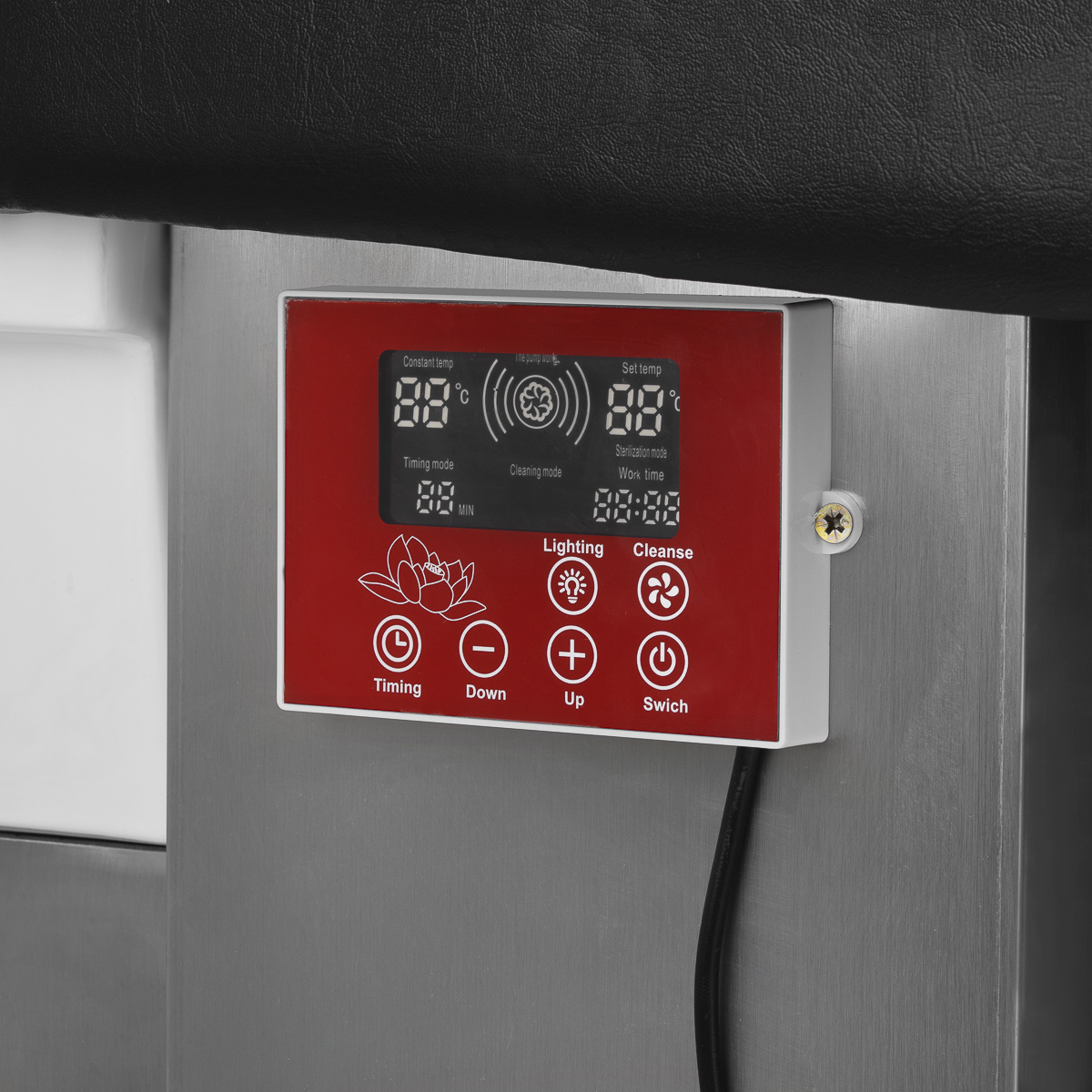 Dotykowy panel sterowaniaIntuicyjny panel dotykowy umożliwia pełną kontrolę nad parametrami zabiegu, zapewniając wygodę użytkowania. Umożliwia regulację czasu pracy oraz temperatury wody, a także monitorowanie ich aktualnych wartości. Dzięki wbudowanemu wyświetlaczowi możesz w każdej chwili sprawdzić, ile czasu urządzenie już pracuje. Panel pozwala również na włączenie funkcji światłoterapii, czyli podświetlenia misy, tworząc atmosferę relaksu i luksusu. Dodatkowo, urządzenie do terapii parowej wyposażone jest w pilota umożliwiającego wygodną obsługę na odległość.