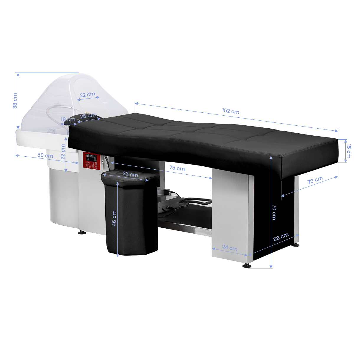 W zestawie: myjnia leżanka, nakładka na misę myjni (steam hood), parownica, dwuczęściowa poduszka, pufa.