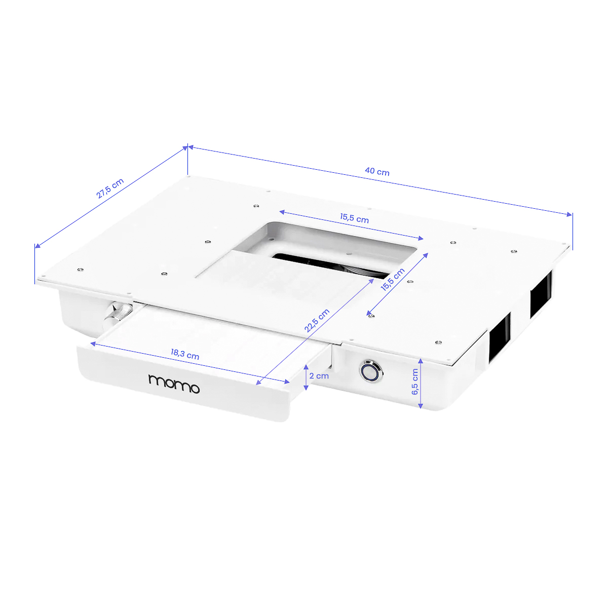 Wbudowany pochłaniacz pyłu kasetowyKasetowy pochłaniacz pyłu Momo J-02 wbudowany w blat znacząco poprawia komfort i higienę pracy, skutecznie usuwając pył powstały podczas zabiegów kosmetycznych, takich jak manicure. Dzięki temu urządzeniu powietrze w salonie pozostaje czyste, a miejsce pracy wolne od zanieczyszczeń, co zwiększa bezpieczeństwo zarówno dla kosmetyczki, jak i klientów. Pochłaniacz pyłu jest łatwy w obsłudze i konserwacji, co dodatkowo podnosi jego funkcjonalność. Regularne czyszczenie oraz wymiana filtra zapewniają niezmiennie wysoką skuteczność pochłaniania. Istnieje możliwość zakupu dodatkowych filtrów wymiennych (SKU 123581). W naszym sklepie dostępny jest również filtr z aktywnym węglem (SKU 123582), który skutecznie eliminuje alergeny i drobnoustroje, podnosząc poziom higieny w salonie.