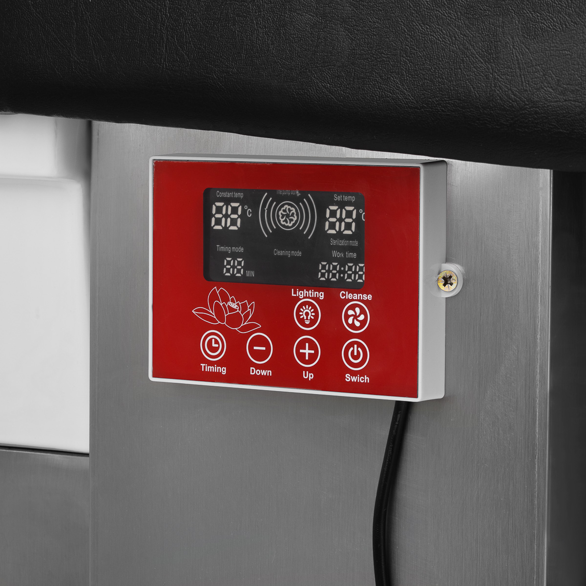 Dotykowy panel sterowaniaIntuicyjny panel dotykowy umożliwia pełną kontrolę nad parametrami zabiegu, zapewniając wygodę użytkowania. Umożliwia regulację czasu pracy oraz temperatury wody, a także monitorowanie ich aktualnych wartości. Dzięki wbudowanemu wyświetlaczowi możesz w każdej chwili sprawdzić, ile czasu urządzenie już pracuje. Panel pozwala również na włączenie funkcji światłoterapii, czyli podświetlenia misy, tworząc atmosferę relaksu i luksusu. Dodatkowo, urządzenie do terapii parowej wyposażone jest w pilota umożliwiającego wygodną obsługę na odległość.