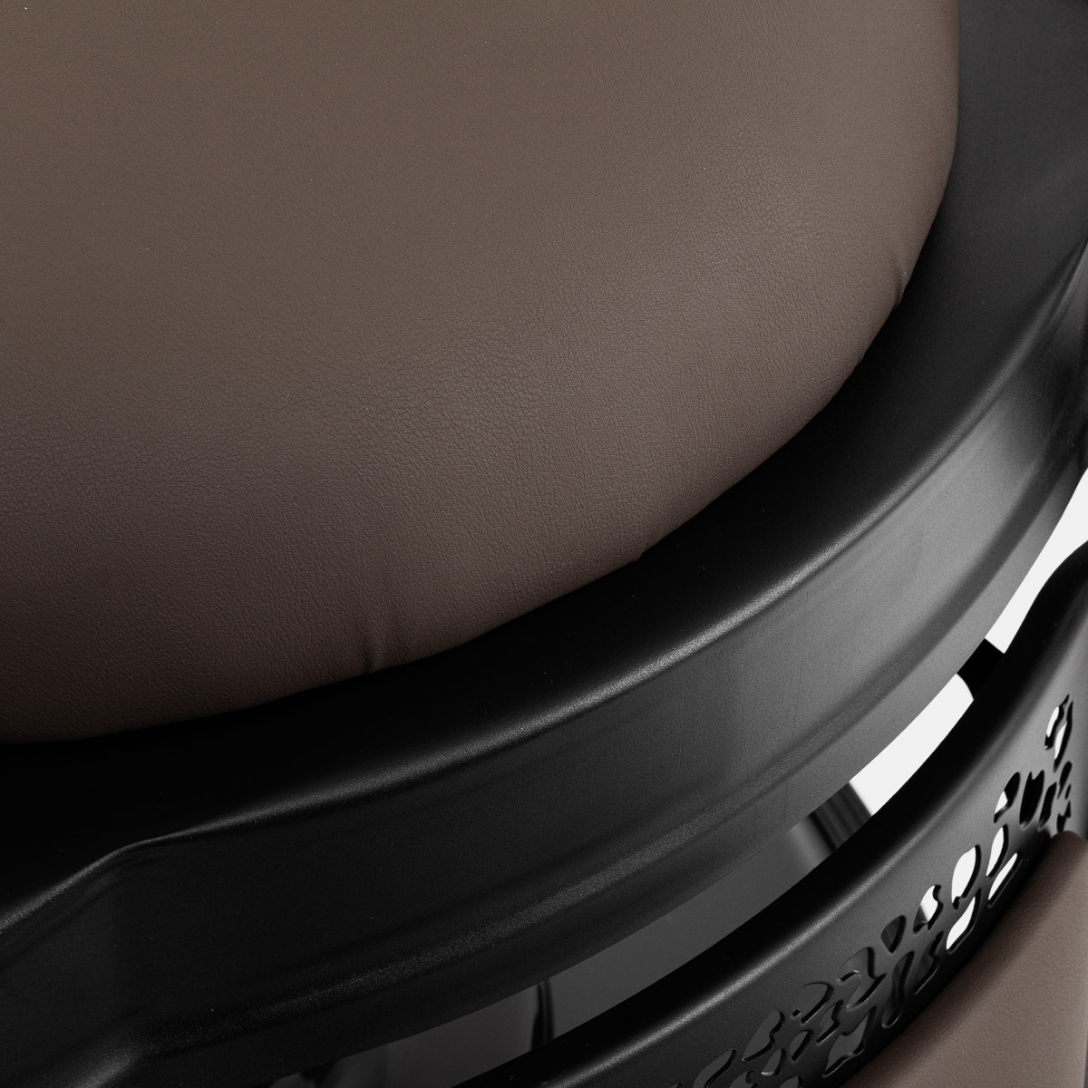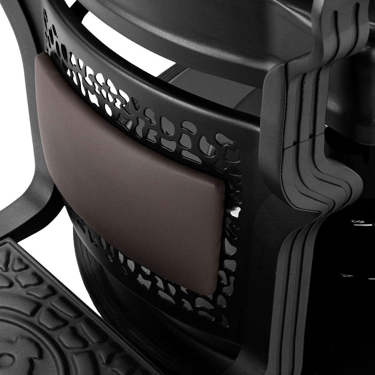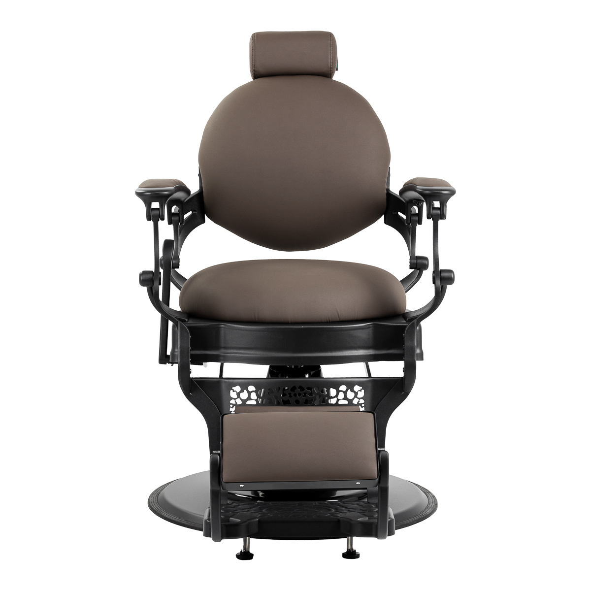 Finezyjny design przy wysokiej funkcjonalnościSolidna konstrukcja podstawy zapewnia stabilność oraz wysoki komfort użytkowania. Wypełnienie siedziska z trwałej, odpornej na odkształcenia pianki oraz obicie wykonane z przyjemnej w dotyku skóry syntetycznej o matowym wykończeniu zapewniają trwałość mebla oraz jego komfortowe użytkowanie przez długi czas. Zastosowane materiały sprawiają również, że sprzęt jest odporny na wilgoć, wytrzymały oraz łatwy do czyszczenia. Pokrycie w odcieniach brązu oraz zdobiony podnóżek nadają mu wyjątkowego charakteru. Fotel o charakterystycznym designie, nawiązującym do stylu vintage, doskonale pasuje do klimatu salonów barberskich, podkreślając ich wyjątkową atmosferę.