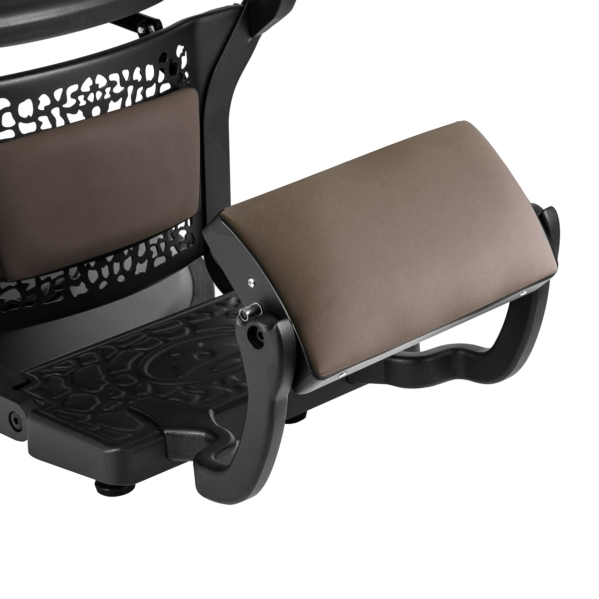 Udogodnienia dla komfortu pracyKomfortowe siedzisko wypełnione pianką gwarantuje klientowi wygodę w trakcie różnorodnych usług. Wyprofilowane oparcie pozwala na zajęcie dogodnej pozycji, zapewniając doskonałe wsparcie pleców, co jest istotne szczególnie podczas dłuższych zabiegów. Wyposażenie fotela w mechanizm pełnego obrotu sprawia, że praca staje się bardziej efektywna i wygodna. Tapicerowane podłokietniki umieszczone na odpowiedniej wysokości umożliwiają prawidłowe ułożenie barków klienta – sprawia to, że nie chowa głowy w ramionach ani się nie garbi – znacząco ułatwiając wykonywanie precyzyjnych zabiegów. Uchwyt na ręcznik pod podłokietnikiem znacznie wpływa na efektywność pracy. Otwór pomiędzy oparciem a siedziskiem ułatwia zachowanie czystości w salonie, pozwalając w łatwy sposób wymieść włosy z każdego zakamarka fotela. Usprawnia to przygotowanie stanowiska pracy pomiędzy klientami.