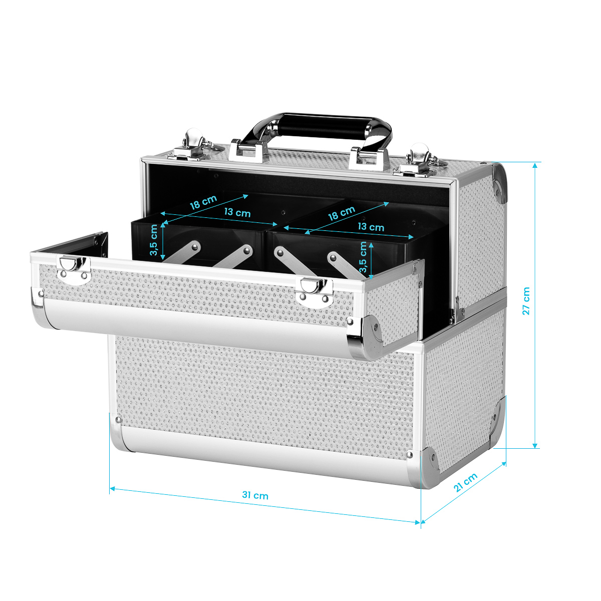 Prosty design i wysoka funkcjonalnośćNowoczesny design w odcieniach srebra z brokatowymi akcentami dodaje elegancji. Rączka ułatwia transport, co jest szczególnie ważne dla mobilnych stylistów. Wykonany z wytrzymałych, odpornych na uszkodzenia materiałów zapewnia komfort użytkowania na co dzień. Solidne zamknięcie na zatrzaski z kluczykiem zapewnia ochronę zawartości, a lekka, trwała konstrukcja sprawia, że kuferek jest łatwy do przenoszenia.
