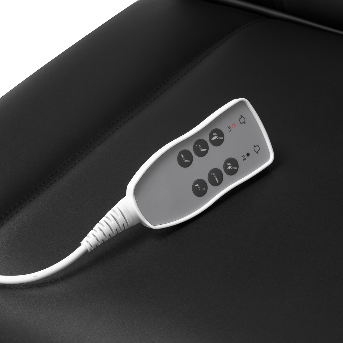 Wygodne sterowanie za pomocą pilota przewodowego pozwala na precyzyjne ustawienie fotela w trzech płaszczyznach: regulacji wysokości, kąta nachylenia oparcia oraz ustawienia podnóżka. Tak zakres regulacji umożliwia dopasowanie pozycji do rodzaju wykonywanego zabiegu – zarówno pod względem komfortu klienta, jak i ergonomii pracy specjalisty. Dla wygody użytkowania pilot można zawiesić na uchwytach umieszczonych po obu stronach siedziska.