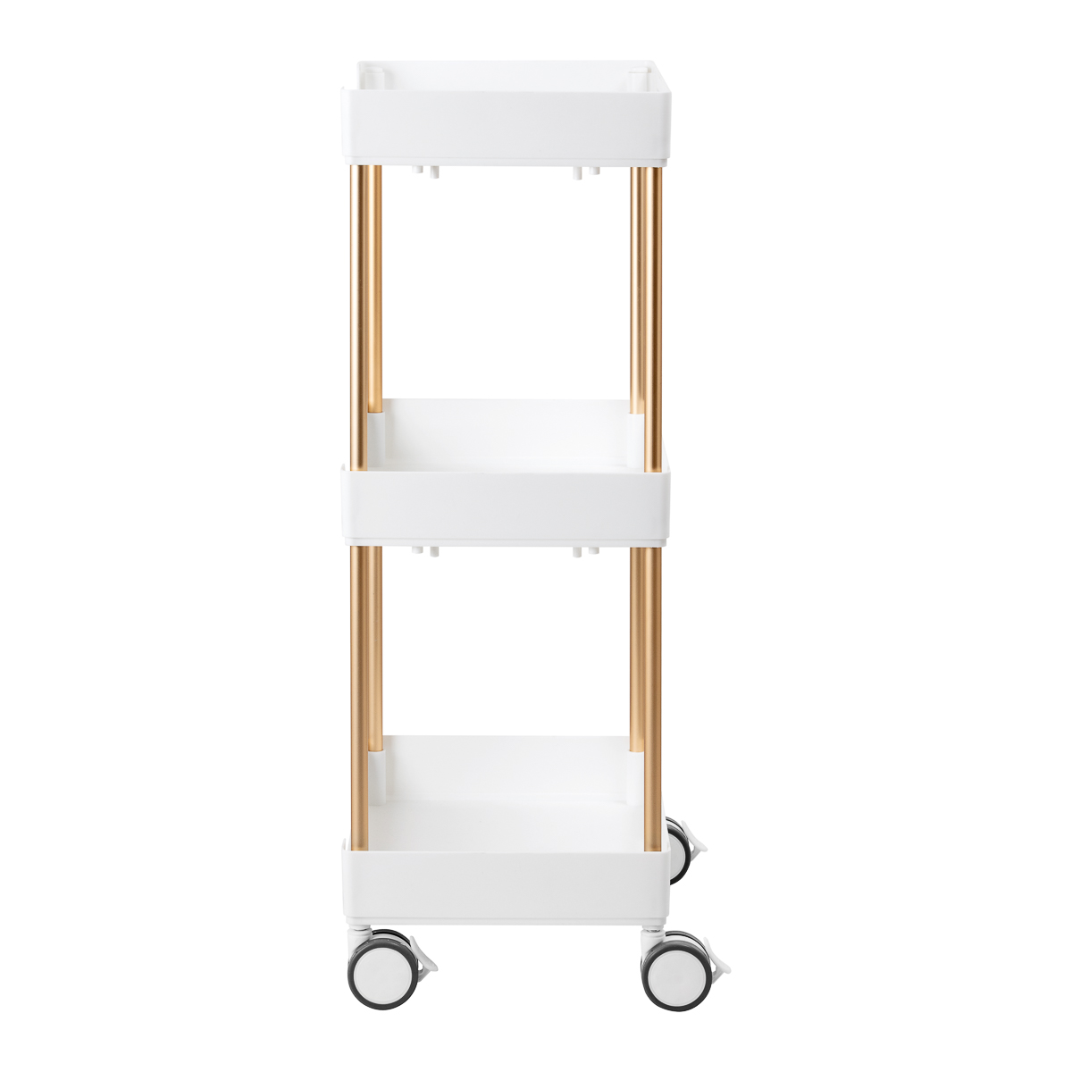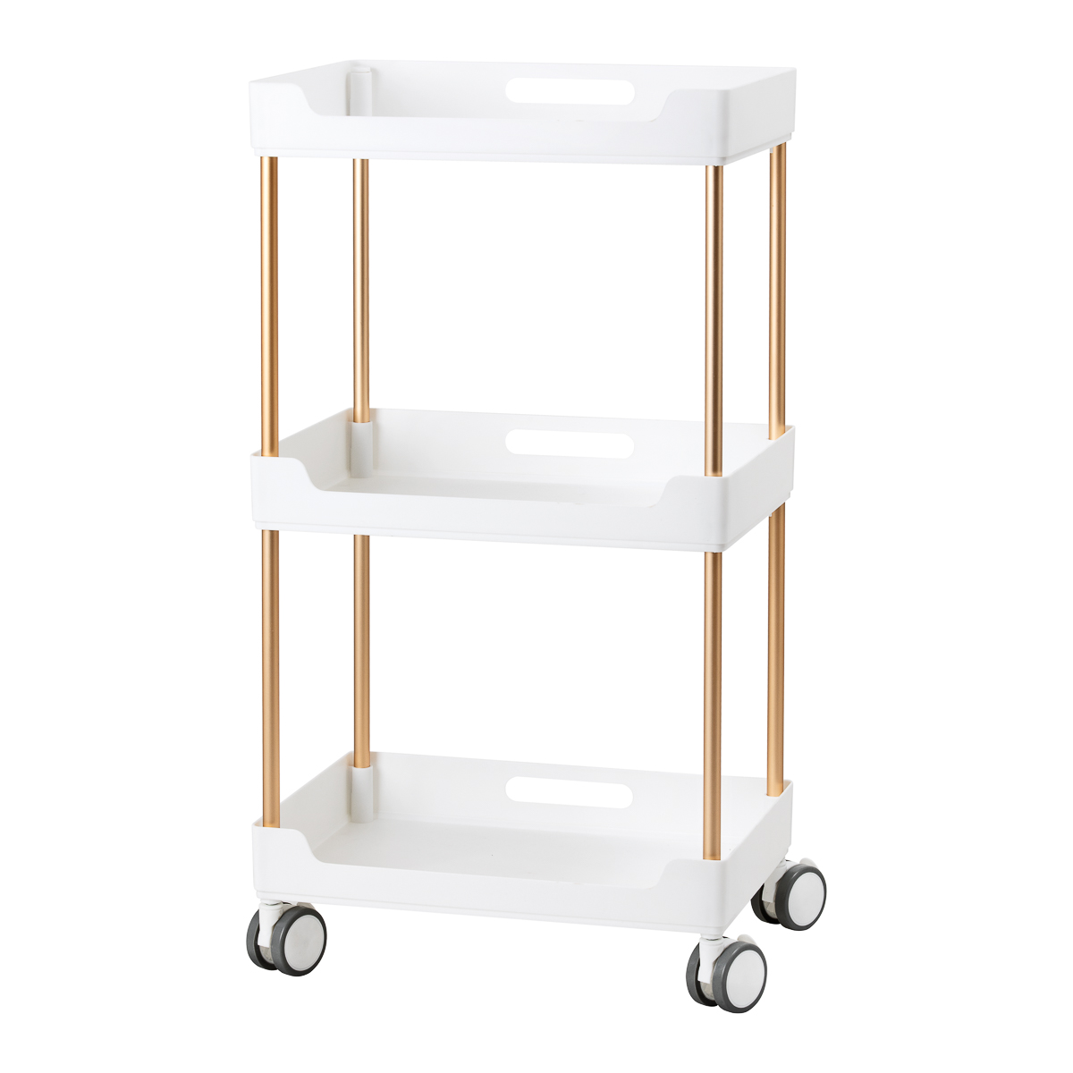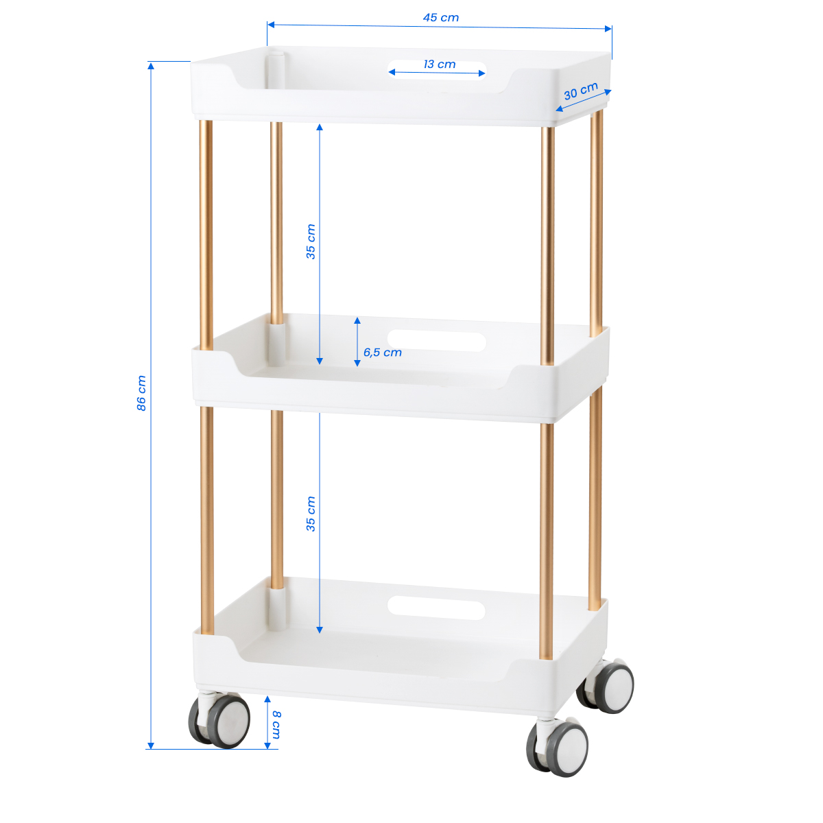 Design dla wygody użytkowaniaPółki wykonane z tworzywa sztucznego w odcieniach bieli w połączeniu z metalowymi rurkami w kolorze miedzi tworzą nowoczesną, estetyczną całość, którą łatwo utrzymać w czystości. Uchwyty na każdej z półek ułatwiają przesuwanie i zapewniają pewny chwyt. Pomocnik wyposażono w cztery kółka z blokadą, co gwarantuje mobilność i wygodę organizacji przestrzeni. Solidne materiały wpływają na trwałość mebla i wygodę jego użytkowania.