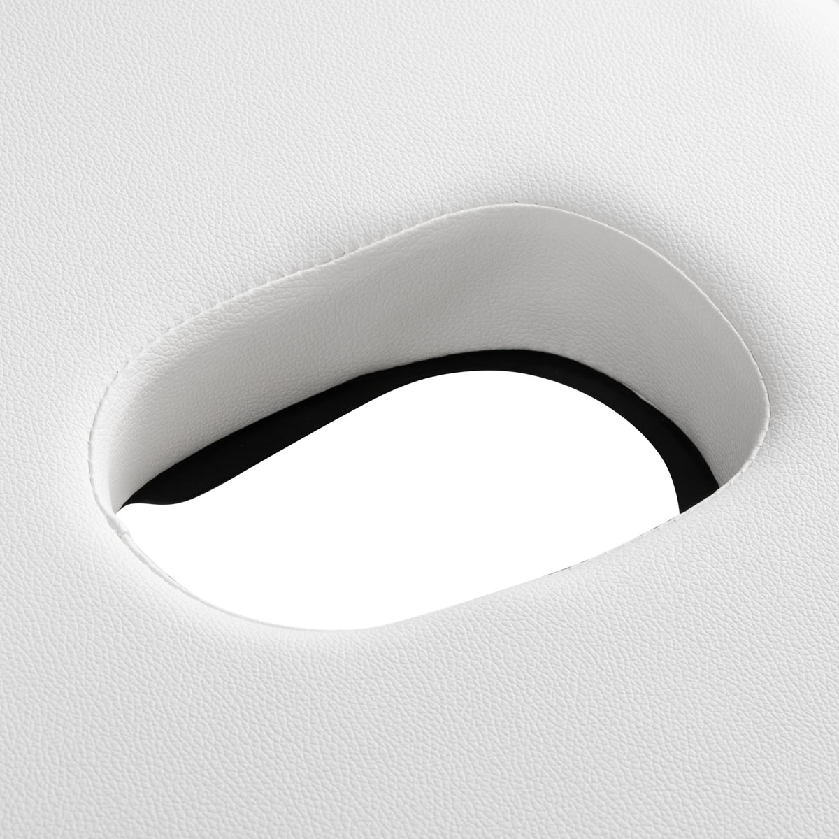 Komfort zabiegów przeprowadzanych na plecachDla zapewnienia maksymalnej wygody osoba korzystająca ze stołu może oprzeć głowę na ergonomicznym zagłówku, który znajduje się w zestawie. Element ten jest łatwy w regulacji – umożliwia dostosowanie kąta nachylenia w dwóch płaszczyznach, co pozwala precyzyjnie dopasować jego ustawienie do potrzeb użytkownika oraz charakteru wykonywanego zabiegu. W przypadku terapii prowadzonych w pozycji na plecach zagłówek można zdemontować, korzystając zamiast niego ze specjalnego otworu w blacie. Gdy nie jest używany, otwór można zakryć dołączoną zaślepką, przywracając powierzchni estetyczny i jednolity wygląd.