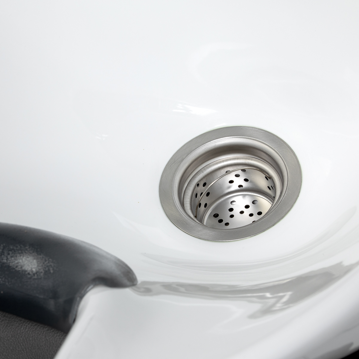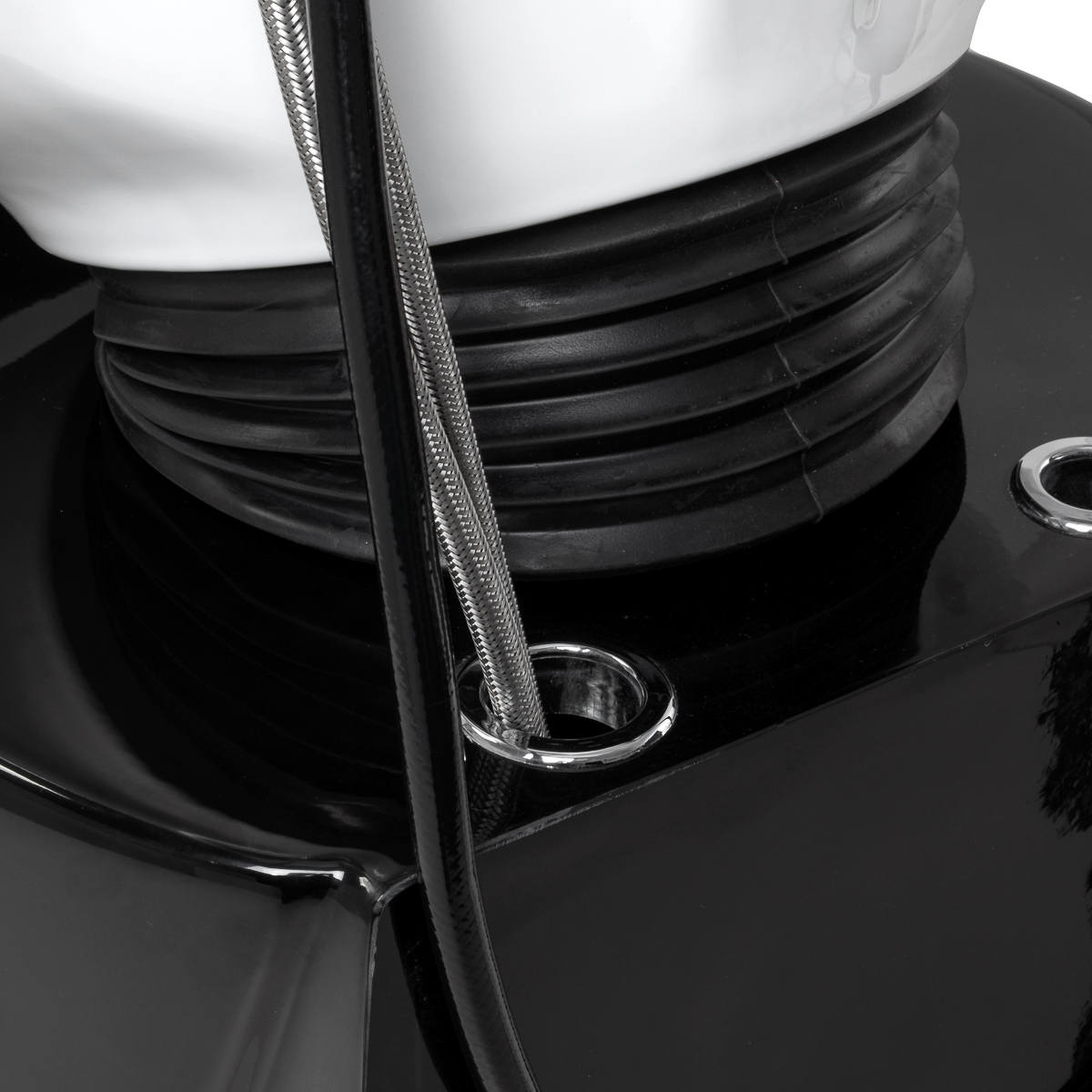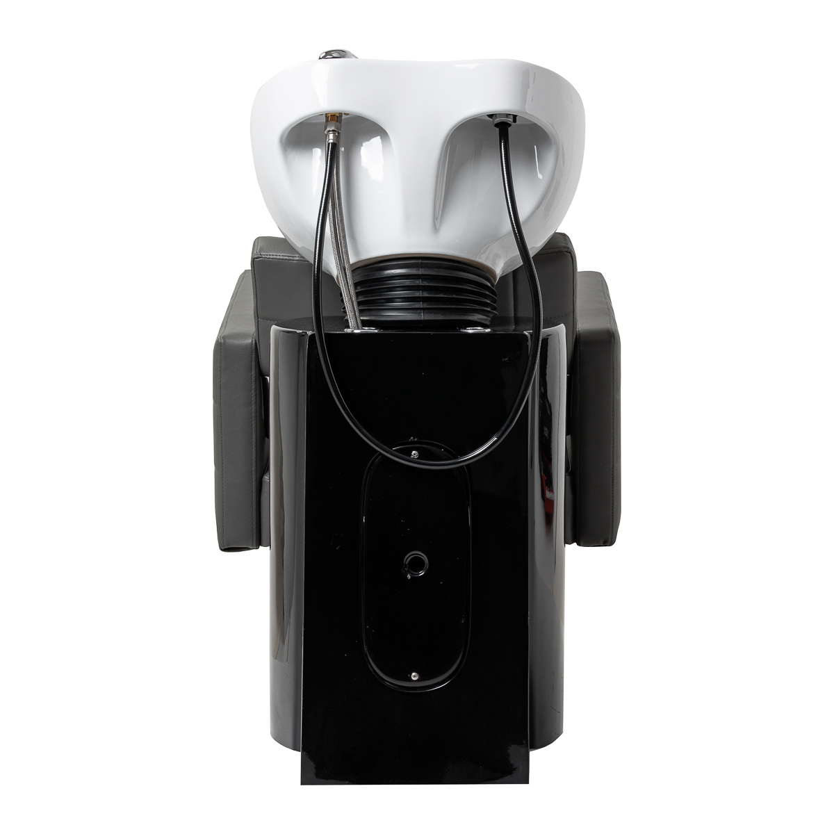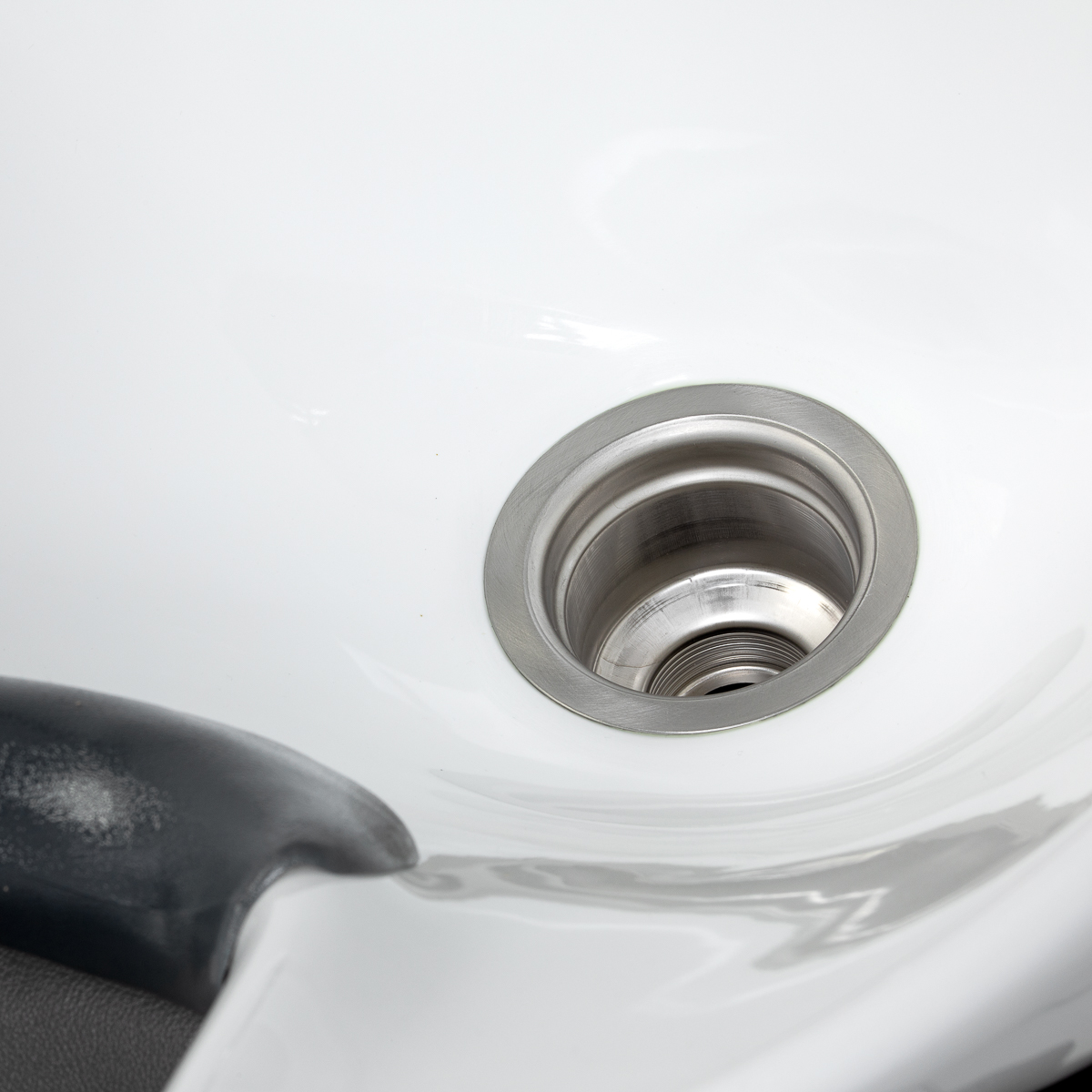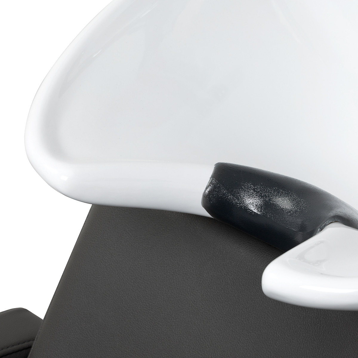 Komfortowe użytkowanieGłęboka ceramiczna misa w odcieniach bieli skutecznie ogranicza rozchlapywanie wody oraz preparatów używanych podczas zabiegów. Sprzyja to komfortowemu i precyzyjnemu wykonywaniu różnorodnych usług fryzjerskich. Ruchoma konstrukcja misy pozwala na łatwe dopasowanie kąta nachylenia do indywidualnych potrzeb. Zastosowany materiał jest trwały, odporny na przebarwienia i zarysowania, a także łatwy w utrzymaniu czystości. Odpowiednio wyprofilowany kołnierz zapewnia wygodne podparcie głowy podczas mycia, natomiast komfortowa nakładka z tworzywa sztucznego w odcieniach czerni eliminuje uczucie chłodu ceramicznej powierzchni.