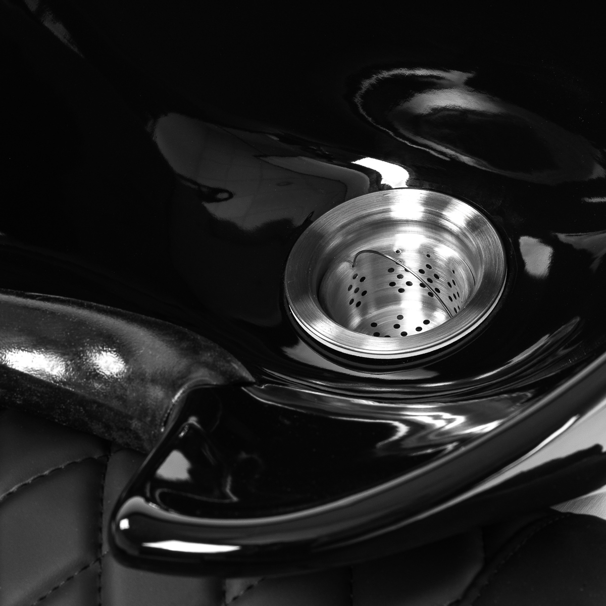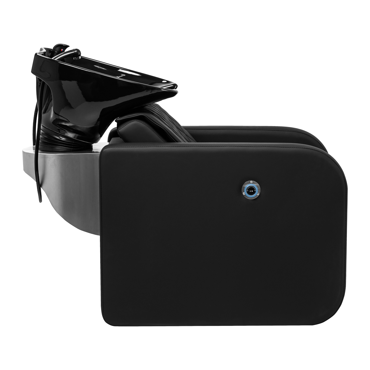 Gustowna umywalka dla wygody użytkowaniaGłębokość ceramicznej misy umywalki w odcieniach czerni pozwala na komfortowe i efektywne wykonywanie szerokiej gamy usług fryzjerskich, zapobiegając nadmiernemu rozchlapywaniu wody oraz używanych w trakcie zabiegu produktów. Zastosowany materiał sprawia, że umywalka jest wytrzymała, odporna na przebarwienia i zadrapania oraz bardzo łatwa do utrzymania w czystości. Odpowiednio wyprofilowany kołnierz oraz nachylone oparcie zapewniają wsparcie i wygodę w trakcie mycia włosów, a dzięki komfortowej nakładce z tworzywa sztucznego w odcieniach czerni klient nie odczuje nieprzyjemności związanych z chłodem ceramicznej powierzchni.