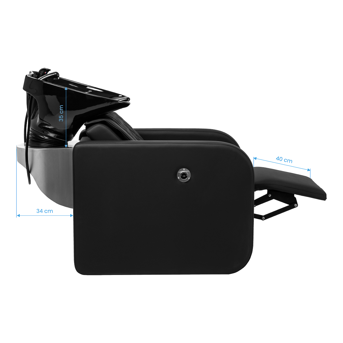 Dostosowanie do potrzebRegulowany elektrycznie podnóżek, sterowany za pomocą przycisków umieszczonych z tyłu fotela, umożliwia precyzyjne dopasowanie pozycji do potrzeb klienta. Ergonomiczne ułożenie ciała pomaga zmniejszyć napięcie mięśniowe, co znacząco podnosi komfort – zwłaszcza podczas dłuższych zabiegów pielęgnacyjnych. To połączenie wygody i funkcjonalności sprawia, że myjnia sprosta oczekiwaniom nawet najbardziej wymagających użytkowników.