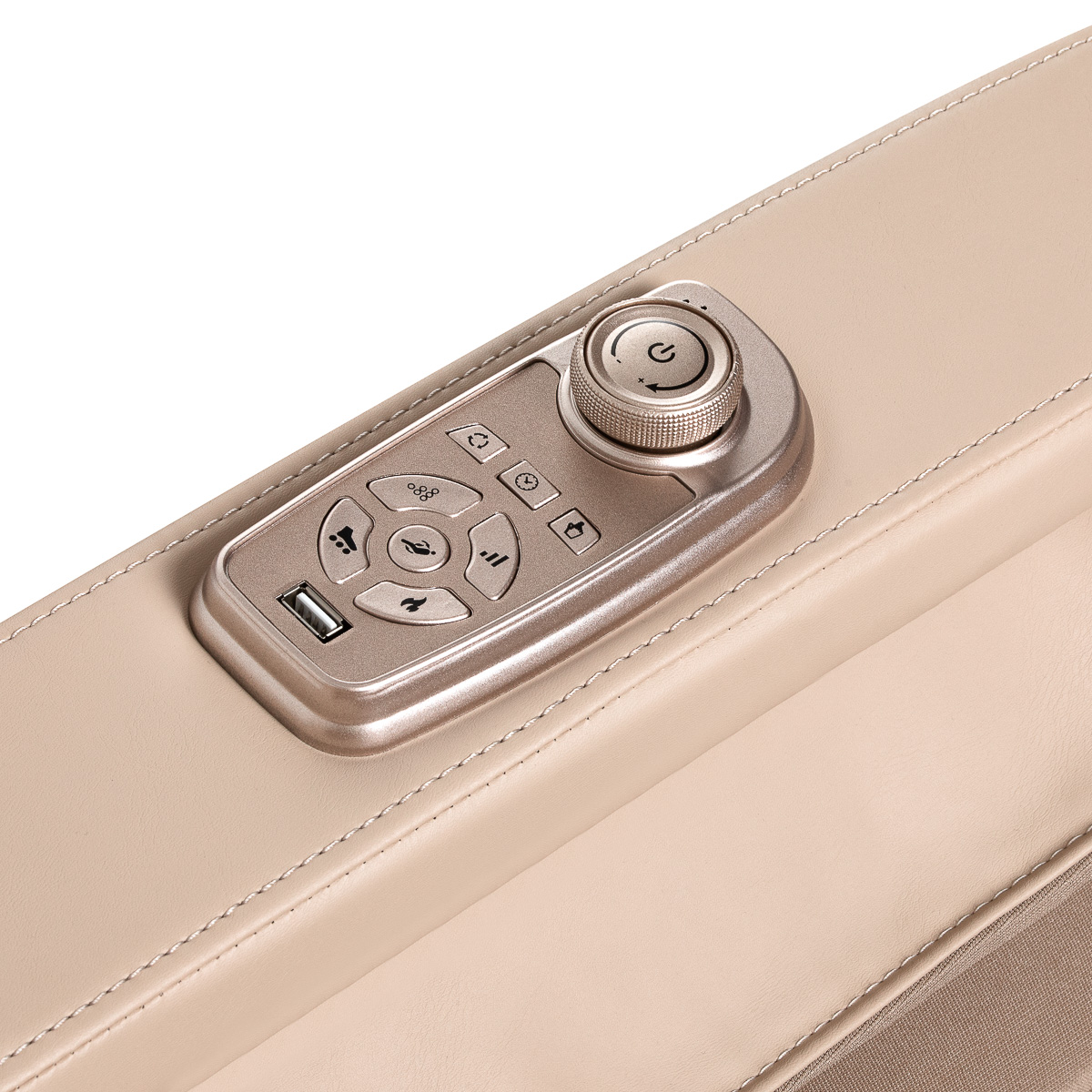 Dla jeszcze większej wygody użytkowania, fotel został wyposażony w zestaw przycisków sterujących wbudowanych w lewy podłokietnik. Podręczny pilot umożliwia szybki dostęp do najważniejszych funkcji bez konieczności sięgania po główny panel. Za jego pomocą można łatwo zmienić tryb masażu, uruchomić masaż stóp lub aktywować funkcję Zero Gravity – wszystko z myślą o maksymalnym komforcie i błogim relaksie. Ponadto wyposażony jest w port USB, co pozwala ładować telefon w trakcie masażu.
