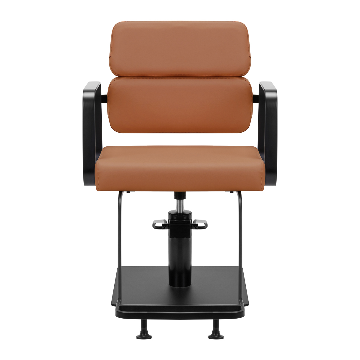 Mechanizm pełnego obrotu, w który jest wyposażony fotel, sprawia, że praca fryzjera staje się bardziej efektywna i wygodna. Solidna, płaska podstawa w kształcie kwadratu gwarantuje stabilność w trakcie użytkowania. Matowo wykończona, gładka powierzchnia nadaje elementowi elegancki wygląd i sprawia, że ten jest łatwy do utrzymania w czystości. Wygodne siedzisko z wypełnieniem z pianki zapewnia wysoki komfort użytkowania, nawet podczas wielogodzinnych zabiegów. Geometryczne, metalowe podłokietniki pozwalają na prawidłowe ułożenie barków klienta – sprawia to, że nie chowa głowy w ramionach ani się nie garbi – co wyraźnie ułatwia wykonywanie precyzyjnych zabiegów, w tym strzyżenia. Dedykowany do tego modelu stylowy podnóżek zapewnia stabilne oparcie dla stóp użytkownika.