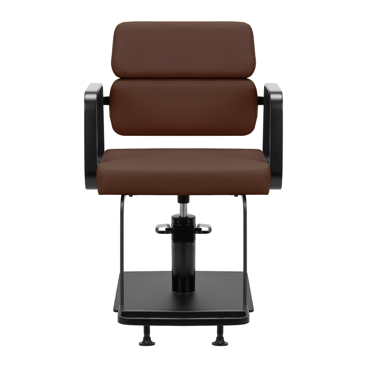 Mechanizm pełnego obrotu, w który jest wyposażony fotel, sprawia, że praca fryzjera staje się bardziej efektywna i wygodna. Solidna, płaska podstawa w kształcie kwadratu gwarantuje stabilność w trakcie użytkowania. Matowo wykończona, gładka powierzchnia nadaje elementowi elegancki wygląd i sprawia, że ten jest łatwy do utrzymania w czystości. Wygodne siedzisko z wypełnieniem z pianki zapewnia wysoki komfort użytkowania, nawet podczas wielogodzinnych zabiegów. Geometryczne, metalowe podłokietniki pozwalają na prawidłowe ułożenie barków klienta – sprawia to, że nie chowa głowy w ramionach ani się nie garbi – co wyraźnie ułatwia wykonywanie precyzyjnych zabiegów, w tym strzyżenia. Dedykowany do tego modelu stylowy podnóżek zapewnia stabilne oparcie dla stóp użytkownika.