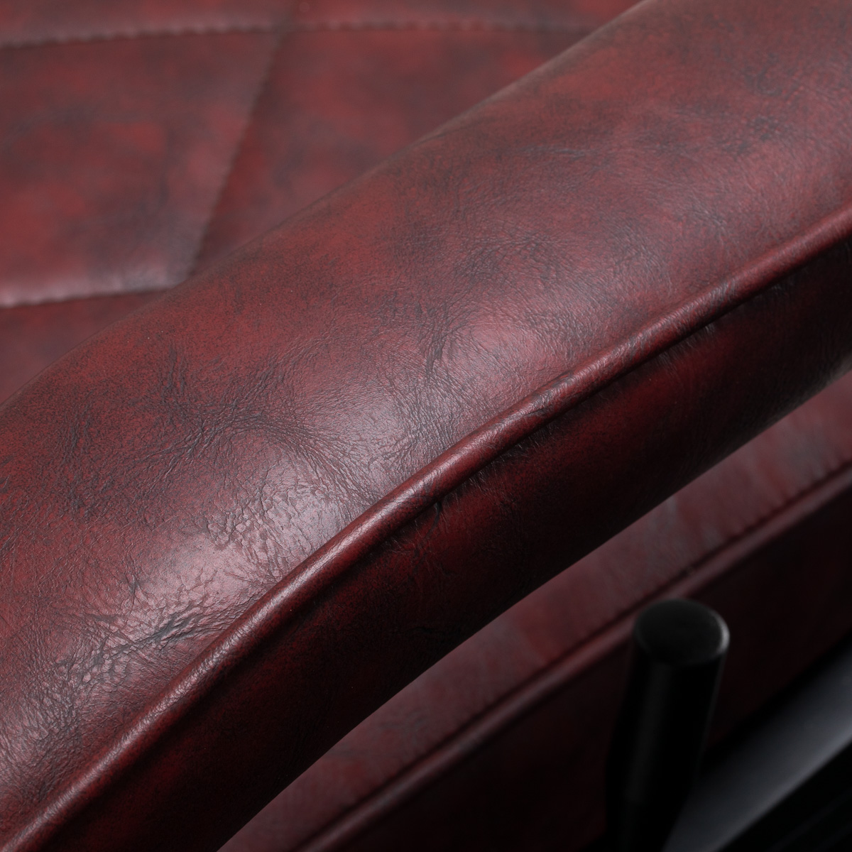 Solidna konstrukcja okrągłej podstawy zapewnia stabilność oraz wysoki komfort użytkowania. Wypełnienie siedziska z odpornej na odkształcenia pianki oraz obicie wykonane z przyjemnej w dotyku skóry syntetycznej o matowym wykończeniu zapewniają trwałość mebla oraz jego komfortowe użytkowanie przez długi czas. Stylowe przeszycia na tapicerce nadają fotelowi charakteru, przywodząc na myśl design motoryzacyjny, co podkreśla jego elegancki wygląd. Sprawiają również, że sprzęt jest odporny na wilgoć, wytrzymały oraz łatwy do czyszczenia. Pokrycie w odcieniach bordo nadaje mu wyjątkowego charakteru, a minimalistyczny styl pozwala mu wpasować się w wystrój każdego salonu barberskiego.